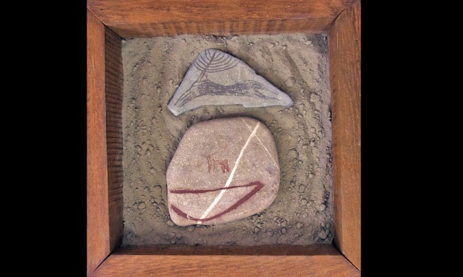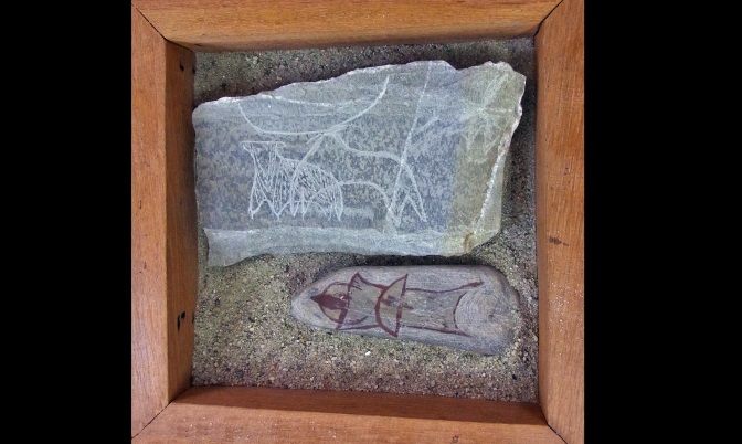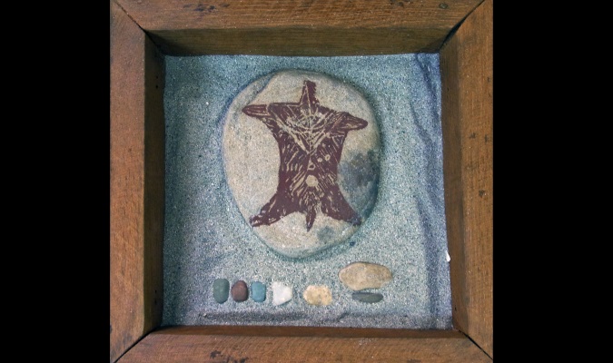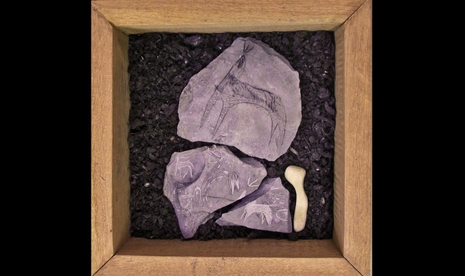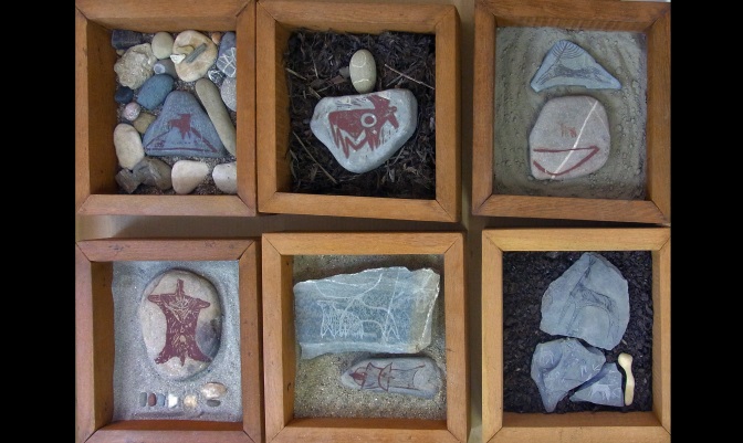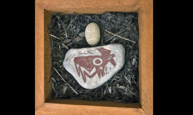 Procesul de imprimare pe piatră l-am început ajutându-mă de linogravură deoarece aceasta mi-a oferit, nu doar actul arhaic (primitiv) al săpării pentru a ajunge la o formă plastică, ci şi forma organică, brută şi sintetică a desenului, rezultată în urma imprimării. Pentru această parte a proiectului, m-am rezumat asupra a două entităţi animalice, bivolul(bizonul) şi cerbul, respectiv asupra a două simboluri primordiale: masculin şi feminin; iar forma este de inspiraţie neolitică de pe teritoriul românesc: cultura Vinča-Turdaş, Hamagia, Cucuteni, Vădastra, Boian, Starčevo-Criș. Punctul, linia, ritmul sunt elementele de limbaj plastic pe care le-am utilizat, plecând de la ceramica şi sculptura specifică culturilor. Unele din lucrări sunt reinterpretări ale unor tipare decorative compuse în aşa fel încât să definească o structură zoomorfă: cum ar fi piatra „Cornut fecund”, care are la bază morfologia Marii Zeiţe din cultura Cucuteni A-B. Pe lângă tehnica linogravurii, am utilizat şi gravura directă pe piatră sau petroglifa. Prin această metodă am reconstituit actul de creaţie a omului primitiv, utilizând instrumente moderne (biaxul şi freza diamantată), dar, totodată, recurgând la incizarea manuală acolo unde mi-a permis piatra (roca moale, de fliş). Gravura pe pietre mi-a oferit ocazia să observ „personalitatea” proprie a acestora. Au rezultat experimente atât cu final fericit, cât si fără.