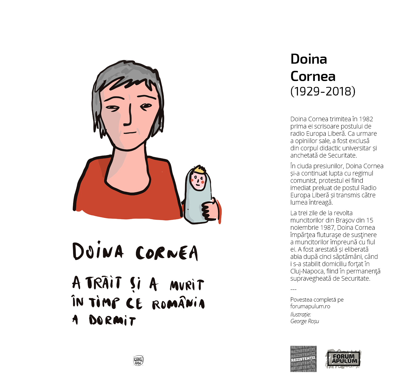 Diana Filimon is the president of the Forum Apulum Association from Alba Iulia. After almost two years since the group was created, the people behind the NGO have organised a different way of delivering uncomfortable history or civics lessons, combining information with illustrations, a mixture between culture and civic attitude. Among the group projects are ”The Resistance”, ”The Illustrated Guide of the Romanian Communism” and the ”Illustrated Guide for The Students”.