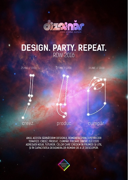 Prin CREEZ, pe 25 mai, Dizainăr propune să vedem ce înseamnă actul creației, iar la petrecerea PRODUC, din 27 mai, vom pune mâna să producem împreună o instalație dedicată designul românesc. La ultima petrecere Dizainăr la Romanian Design Week 2016, CUMPĂR, întâmpinăm vara pe 3 iunie cu o petrecere în grădina din fața magazinului și cu o selecție de obiecte de design la un preț special.