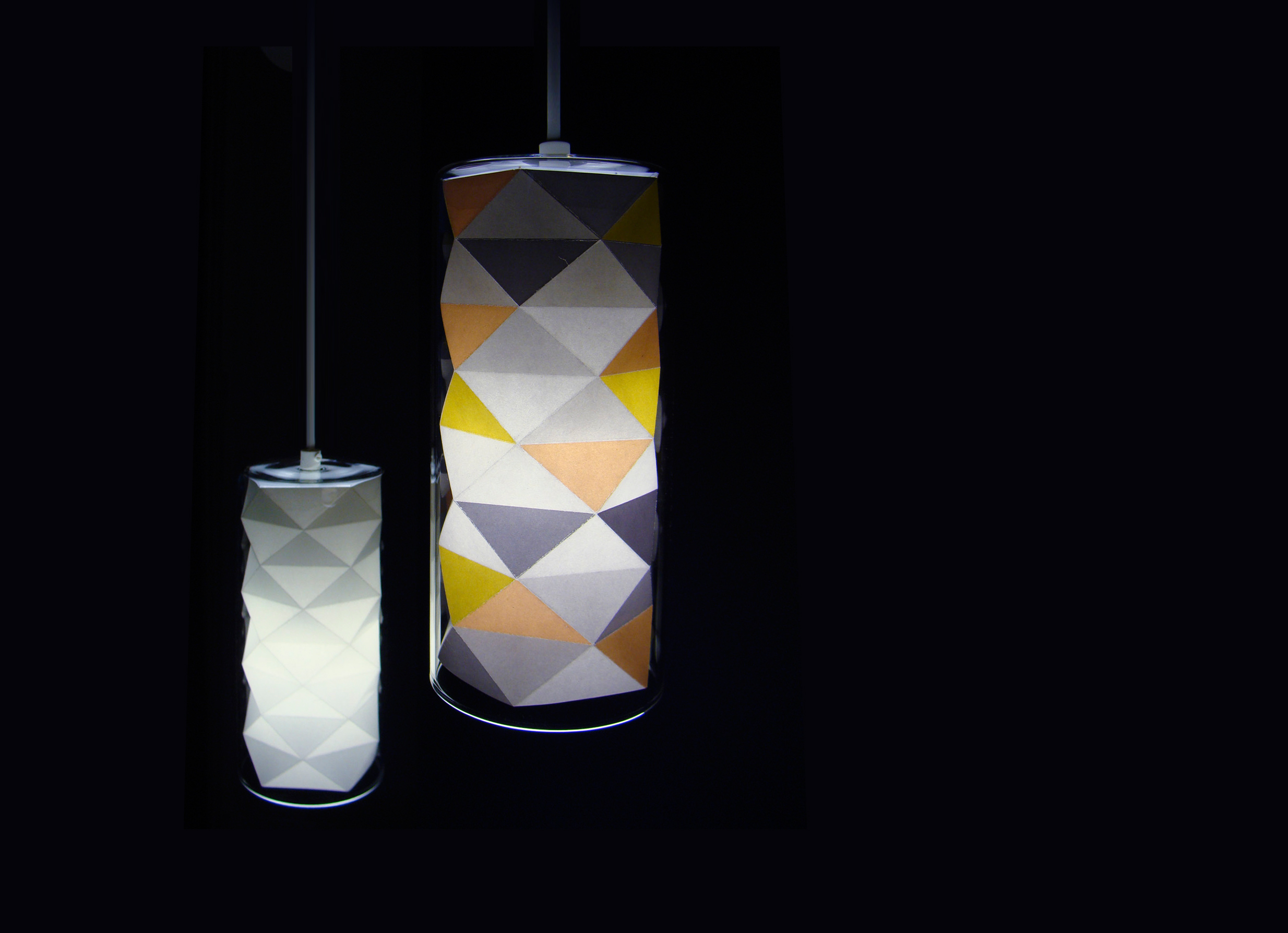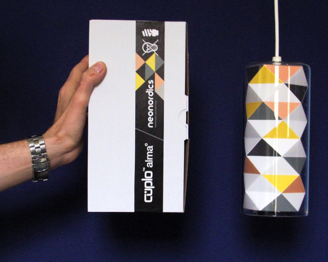 Cuplo™ Alma, similar to Cuplo™ Vasa, has a personalized interior, handcrafted of folded origami paper and a body made of borosilicate glass. The lamp is fitted with a 1.5 m long electric cable and a white plastic electric junction box.