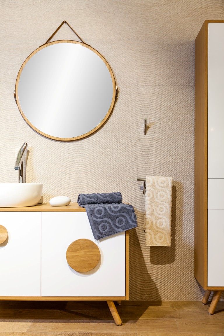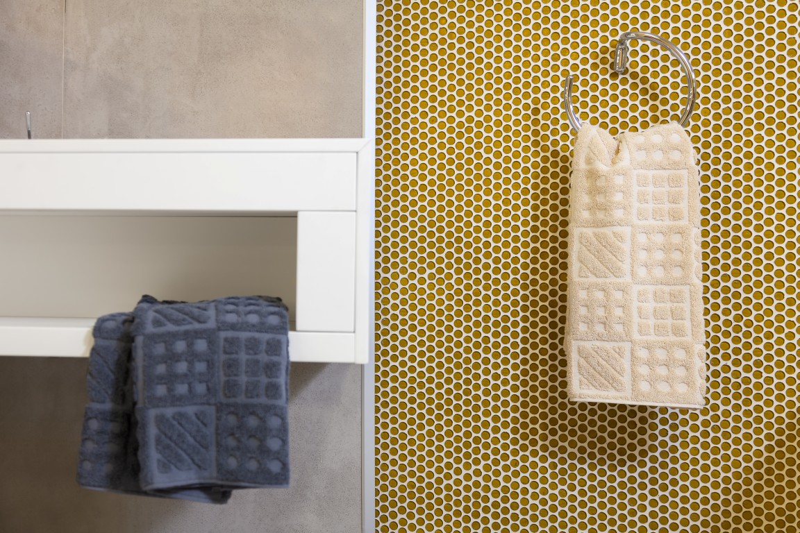 The 6 models in this collection - Art Deco, Bauhaus, Geometry, Fisheye, Chromosome and Le grand K, are available for textile design projects, upholstery and interior design. The standard color variants are petrol grey, grey and white, nuances of green, turquoise and green, but they can be adapted and scaled according to the project in various chromatic and dimensional versions of the models. The models are presented in an array of printed fabrics for upholstery projects, and also in a series of monochromatic towels, with relief models, and can be adapted also in wallpaper models, lattice work or relief applications.