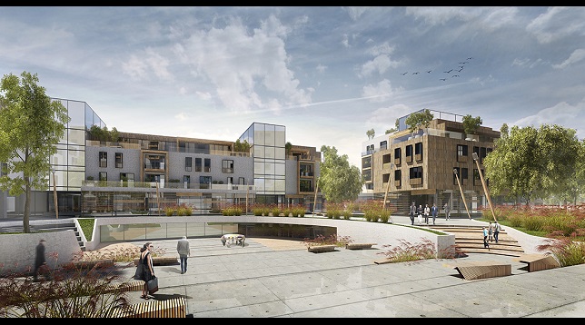 Conceptul proiectului este de a raționaliza volumele destructurate și țesutul urban prin crearea unui volum puternic, simplu, orientat către râu, iar în partea din spate a acestuia, alte trei volume simple ce sunt poziționate perimetral în cadrul sitului, generând o curte interioare cu un caracter semipublic. De asemenea, beneficiile oferite de prezența râului sunt valorificate prin migrarea vegetației în interiorul curții și de-a lungul clădirilor, prin realizarea unui pasaj ce conectează piațeta cu râul și prin dezvoltarea unei promenade verzi în interiorul volumului orientat către râu.