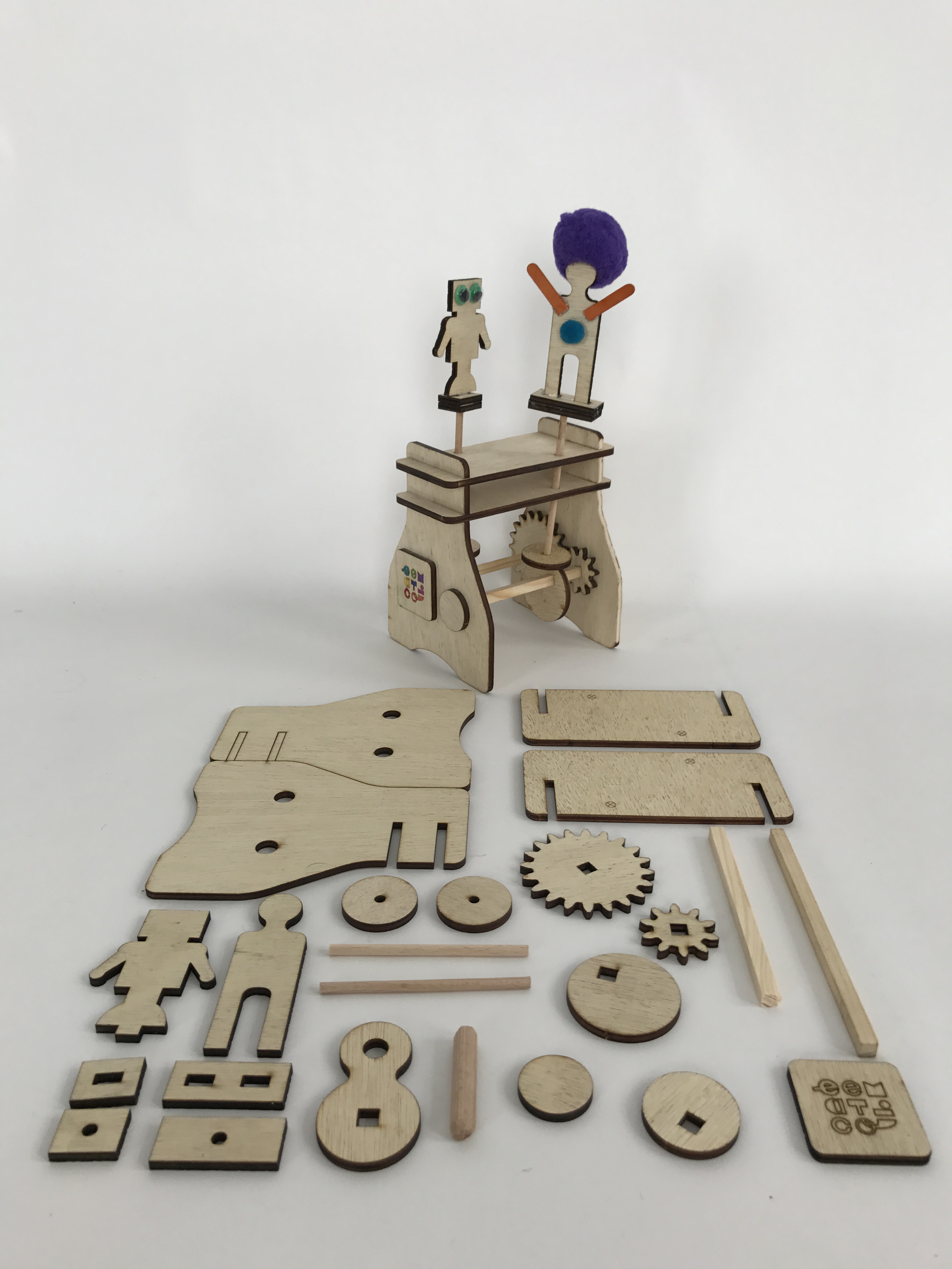 The automaton is a toy that uses gears to animate characters. The camshaft and the cogwheels, inspired from devices used in modern combustion engines, determine the movement of the two characters, that challenge the young ones to use their creativity and personalize them.