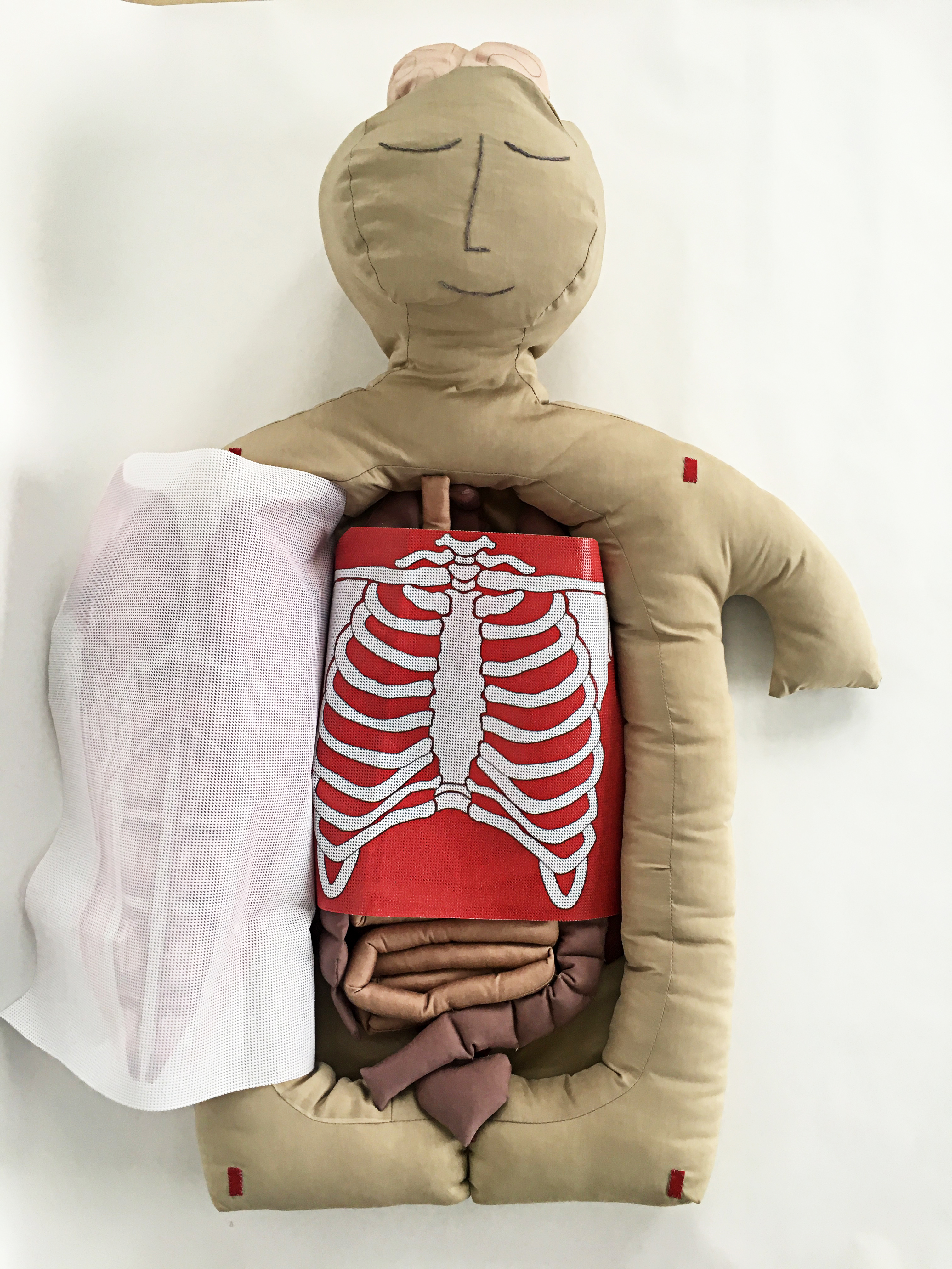 Under the skin, the children discover the layers of muscles and the ribs. Underneath them, one can discover the organs. And then it’s question time: Are the heart and lungs friends? Is the gallbladder in a good relationship with the liver? And how about the stomach? Does it work alone or not?