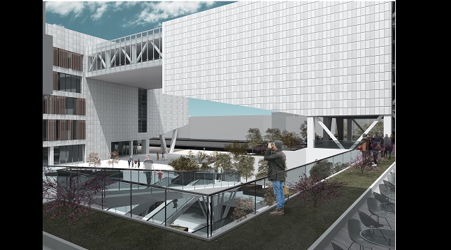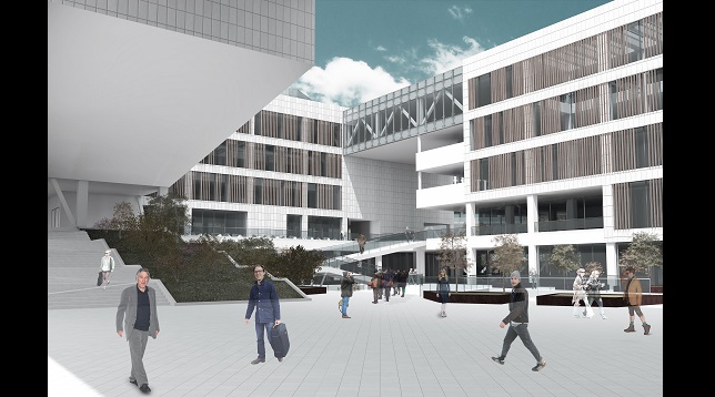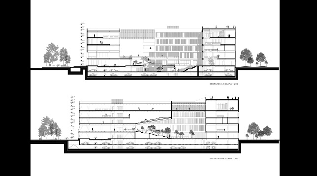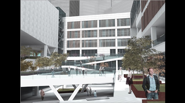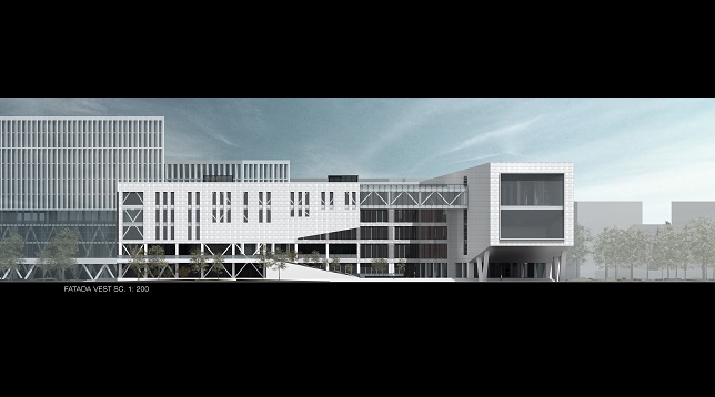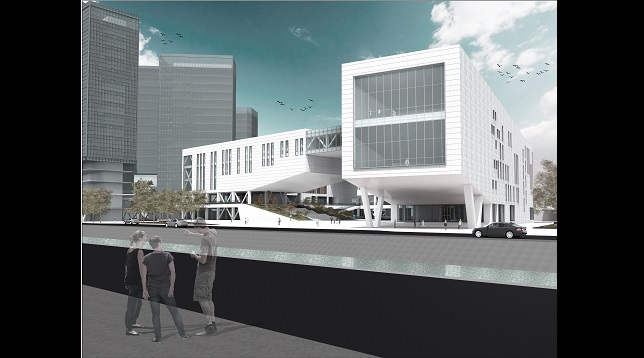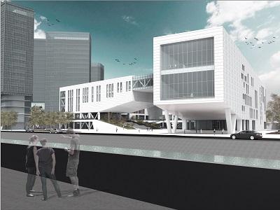 Volumul propune un front la apă însă retragându-se față de aliniamentul zonei și bulevardului și printr-o mică piațetă care să capteze publicul și să îl orienteze către curtea interioară a ansamblului. De asemenea volumul reușește printr-o aripă a clădirii să închidă vizual piața formată la intersecția celor două bulevarde.