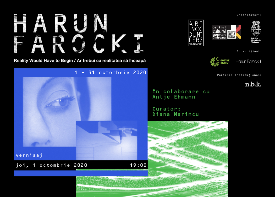 Fundația Art Encounters și Centrul Cultural German Timișoara organizează, în perioada 1 – 31 octombrie 2020, o amplă expoziție dedicată lui Harun Farocki, unul dintre cei mai importanți cineaști germani. Realizată cu sprijinul unor instituții de renume, precum Goethe Institut, Harun Farocki GbR și Neuer Berliner Kunstverein, Harun Farocki – Ar trebui ca realitatea să înceapă este cea mai mare expoziție dedicată regizorului în România.