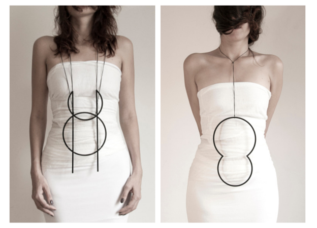 If the basic geometrical elements are composing two-dimensional figures on a lifeless medium, when worn, a third dimension is being revealed. When put into relation with the human body they underline different aspects of its dynamics, like the skeleton and the muscular system or of the feminist and fertility symbols like the coeliac area.