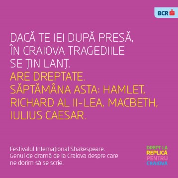 BCR, sponsor al festivalului încă de la prima ediție, a creat o campanie de susținere și un call to action către presa din România, cu ajutorul creativ al agenției de publicitate Cohn&Jansen JWT, în contextul în care, de-a lungul anilor, presa a fost mai atentă la rivalitățile dintre clanuri, la răfuielile în plină stradă sau la alte subiecte de „scandal”, din Cetatea Băniei. Campania a fost oferită craiovenilor ca un instrument cu ajutorul cărora ei să ceară Dreptul la Replică pentru Craiova: "Festivalul Internațional Shakespeare este genul de dramă de la Craiova despre care ne dorim să se scrie. Invităm presa din România ca în perioada celei de-a X-a ediții să fie alături de noi."