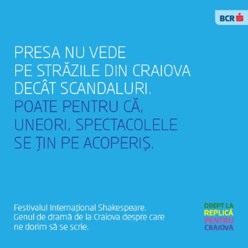 Am pornit de la o realitate - lipsa de vizibilitate în presă a Festivalului Internațional Shakespeare de la Craiova - și de la nevoia de a aduce o nouă pespectivă asupra acestui oraș, despre care, ani de-a rândul, s-a scris mai mult de rău decât de bine. Orice inițiativă pozitivă, orice act cultural din Bănie intră automat într-un con de umbră din această cauză. Este incredibil cum o percepție negativă asupra unui oraș poate să afecteze credibilitatea unui Festival de o asemenea anvergură. Am dorit să corectăm această percepție greșită asupra Craiovei și să dăm dreptul la replică acestui oraș, prin vocea celor mai afectați de ceea ce se scrie, craiovenii. Mulțumim comunității Craiova Cetatea Băniei și mulțumim Shakespeare că ești atemporal. – Felicia Stoica, Senior Copywriter Cohn&Jansen JWT
