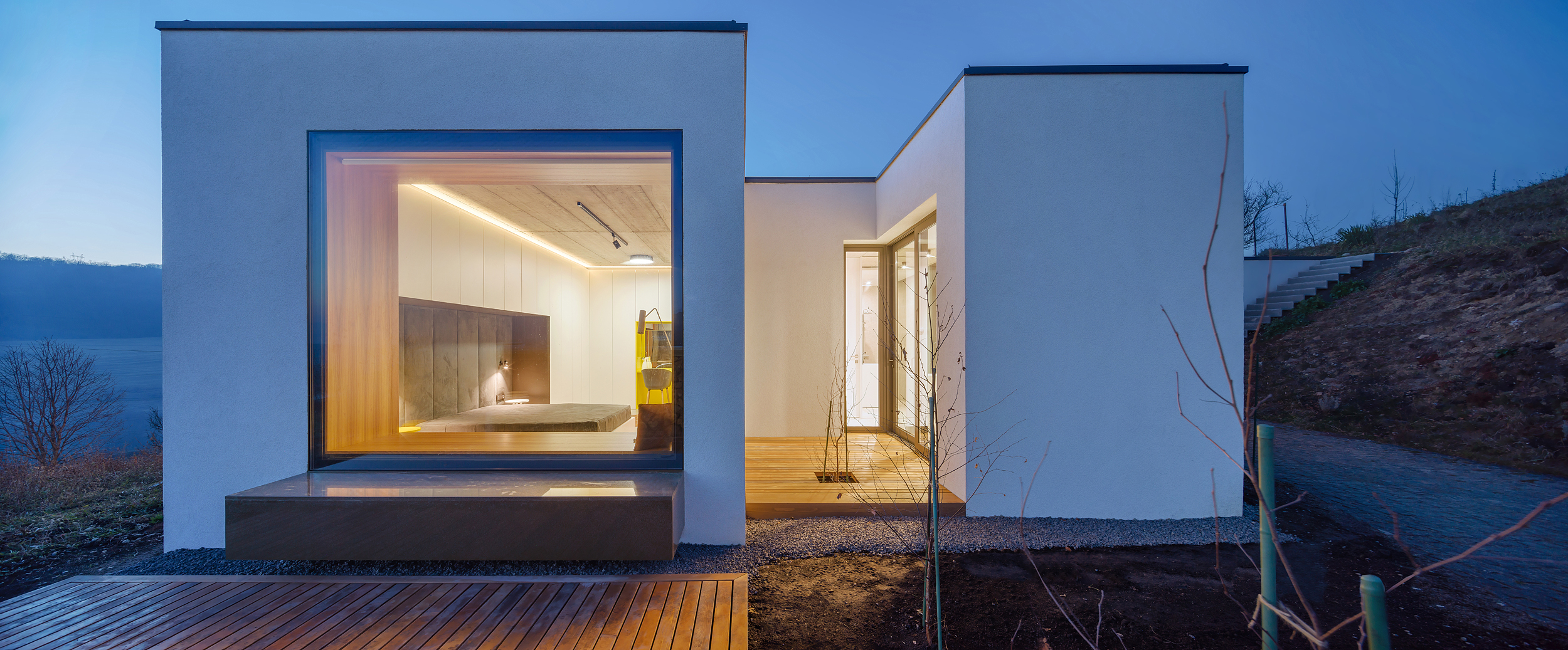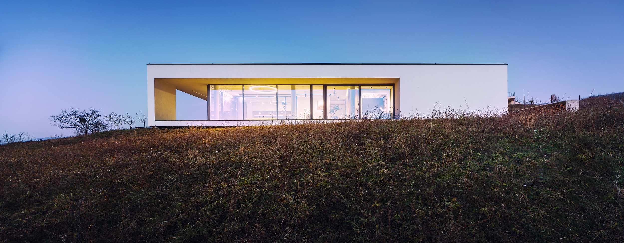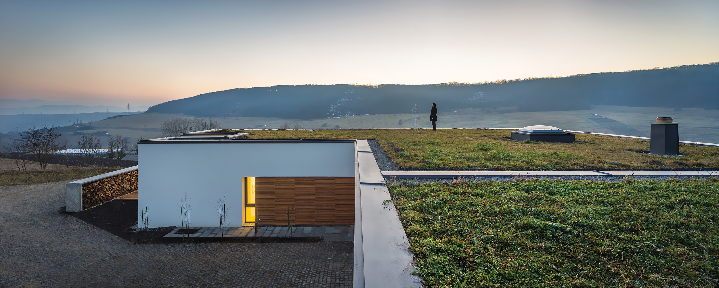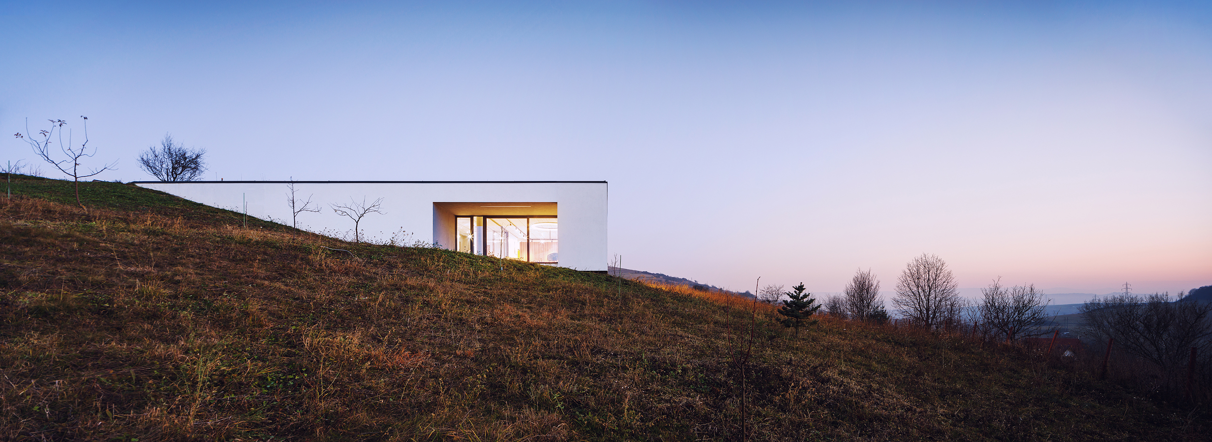 The lines of the terrain and the lines of the house are in contrast, empowering themselves. The house replaces the land it occupies by having a grass roof flooded with local species found in the area, helping it to blend in. The volume is simple and compact, with transparent surfaces arranged in a series of deep cuts, designed and sized based on studies of sunlight and view.