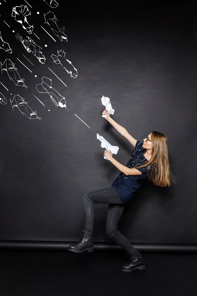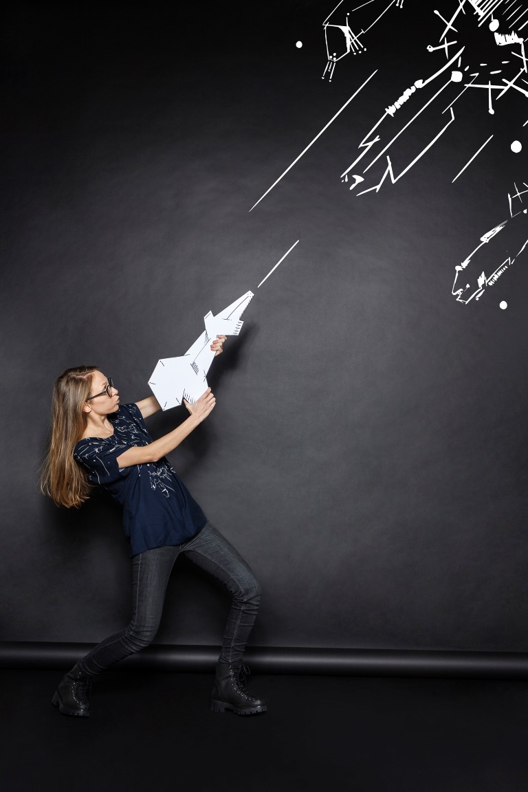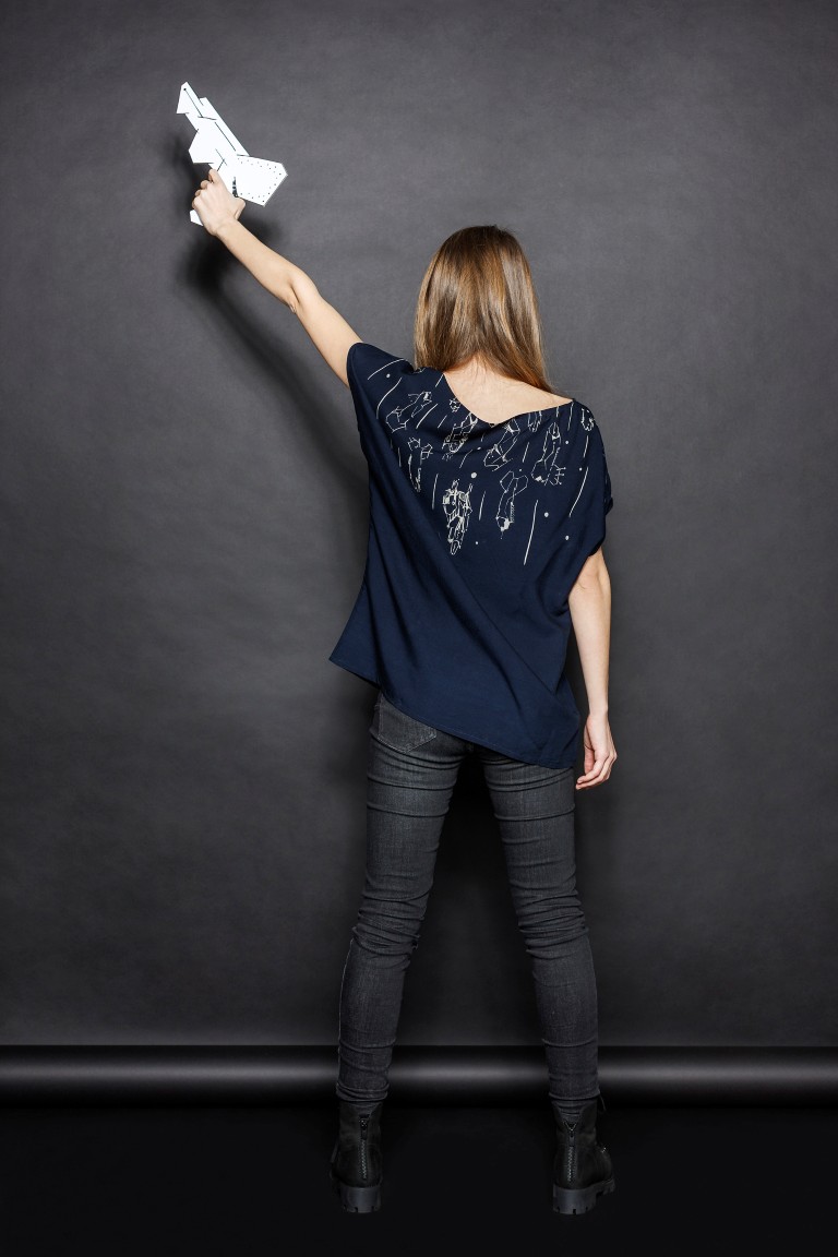 In the screen printing studio, Mihai Popescu creates geometric patterns, plays with forms, sizes, contexts, observing how graphic elements react when they are applied on a soft and mobile surface. This project is called”space invaders”- invasion and attack, an abstract pattern screen printed manually on natural fabric tops (viscose+cotton).