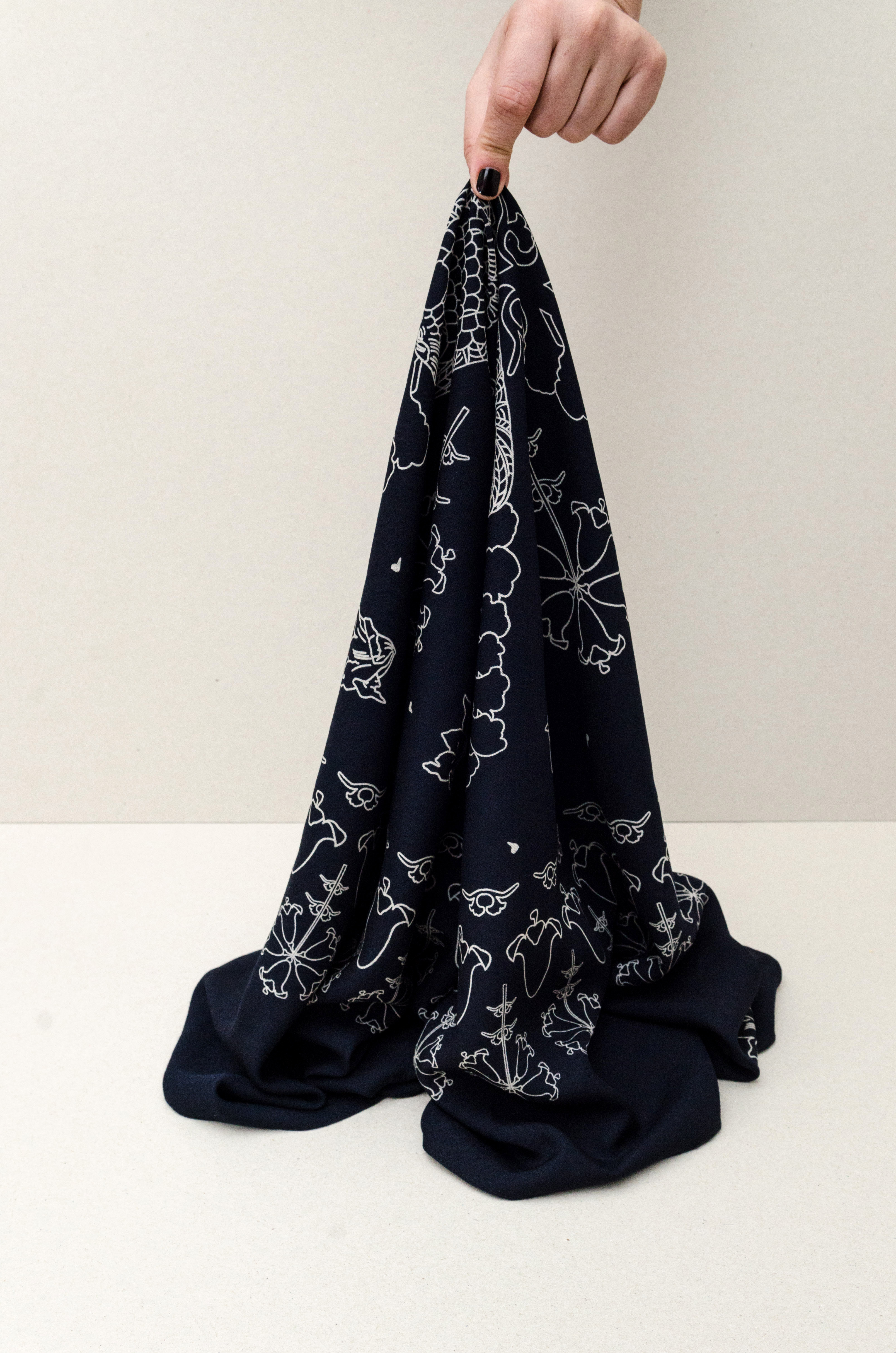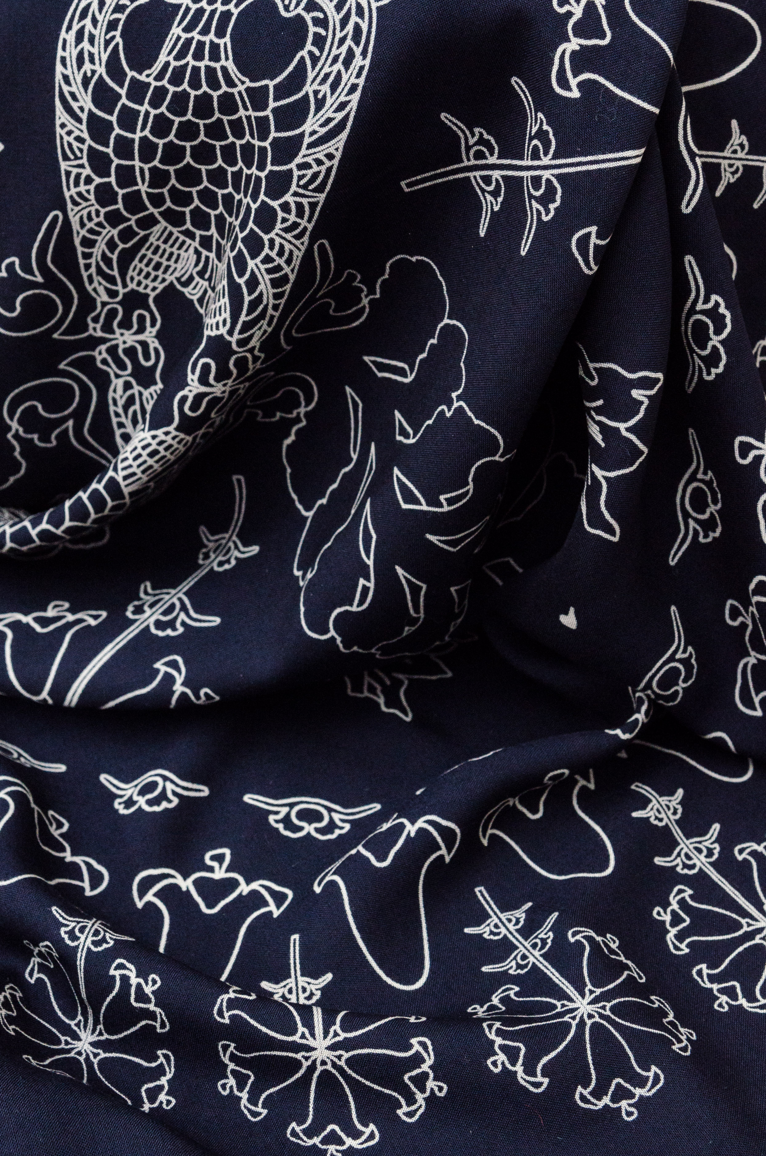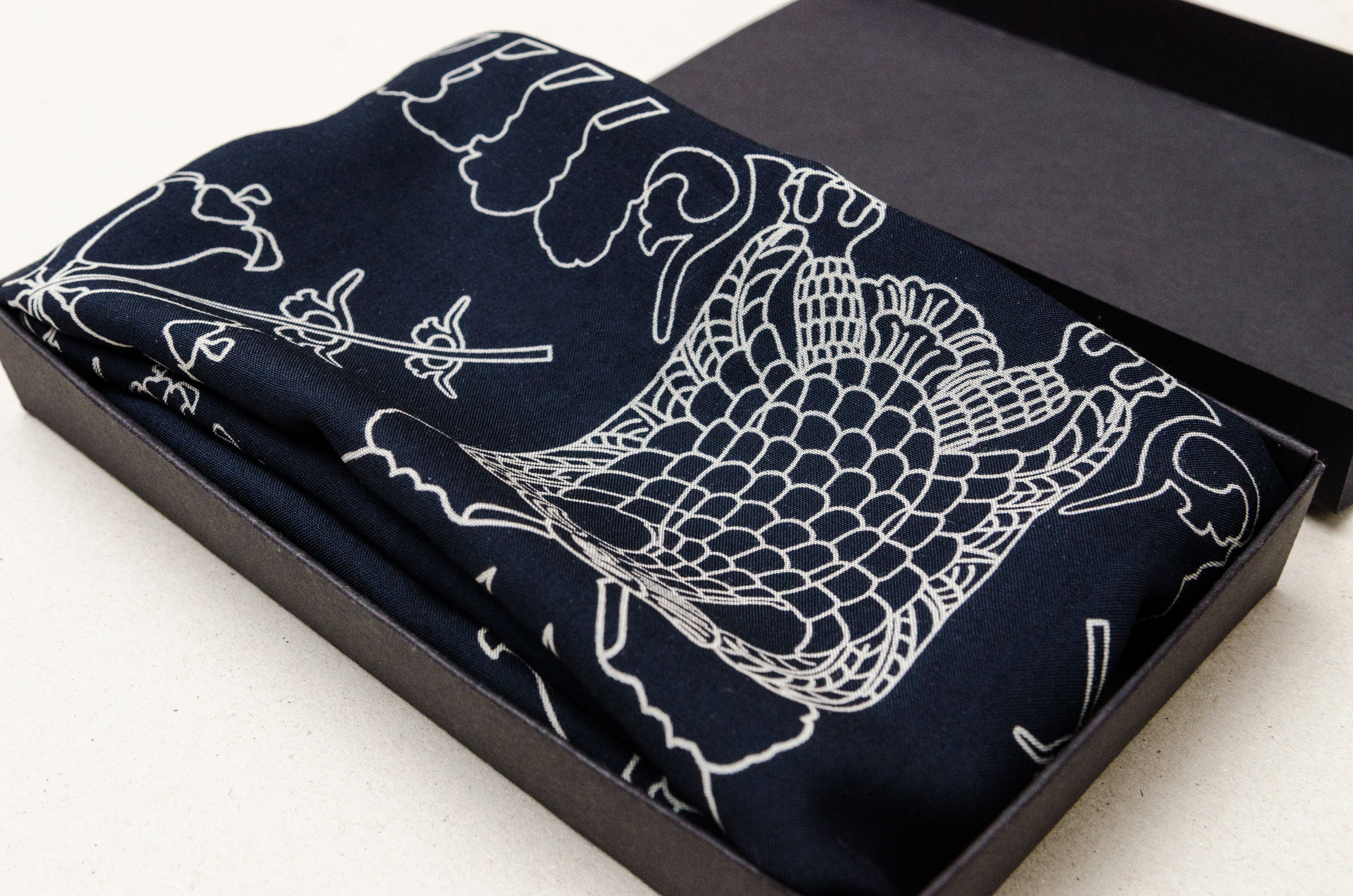 The scarf brings together craftsmanship and contemporary design. It embodies the qualities of both a souvenir and a fashion accessory and, at the same time keeping an aesthetic connection to the Cotroceni Museum. The design features key symbols such as the tree of life and the eagle, present as ornaments on the chairs in the royal dining room as well as Queen Mary's lilies.