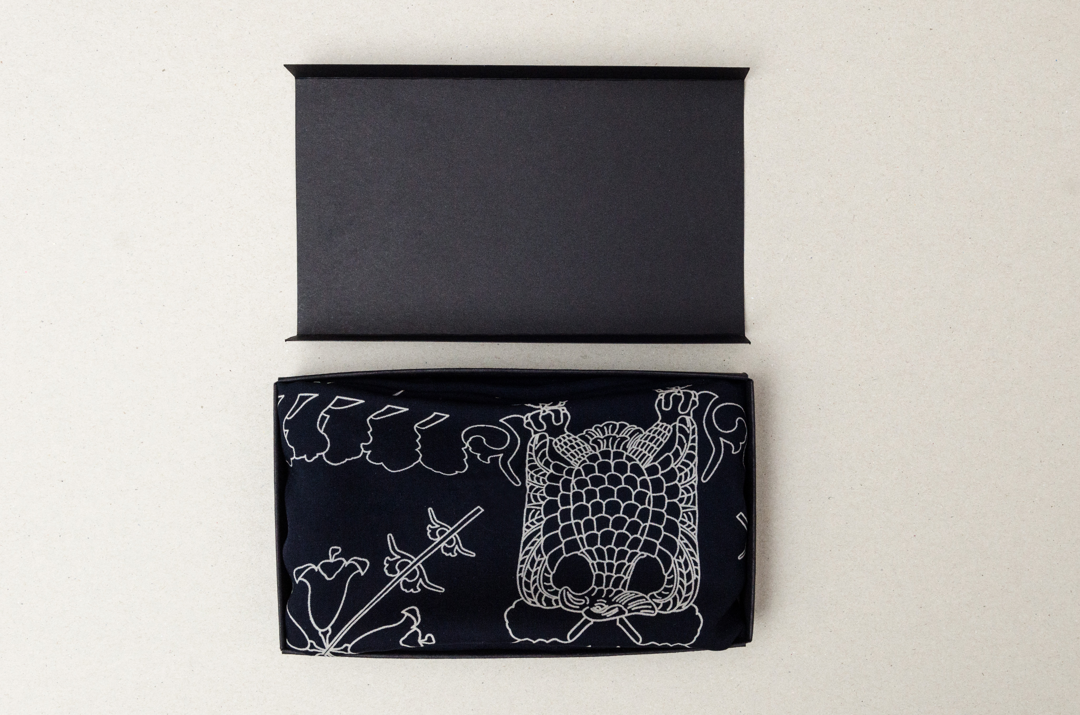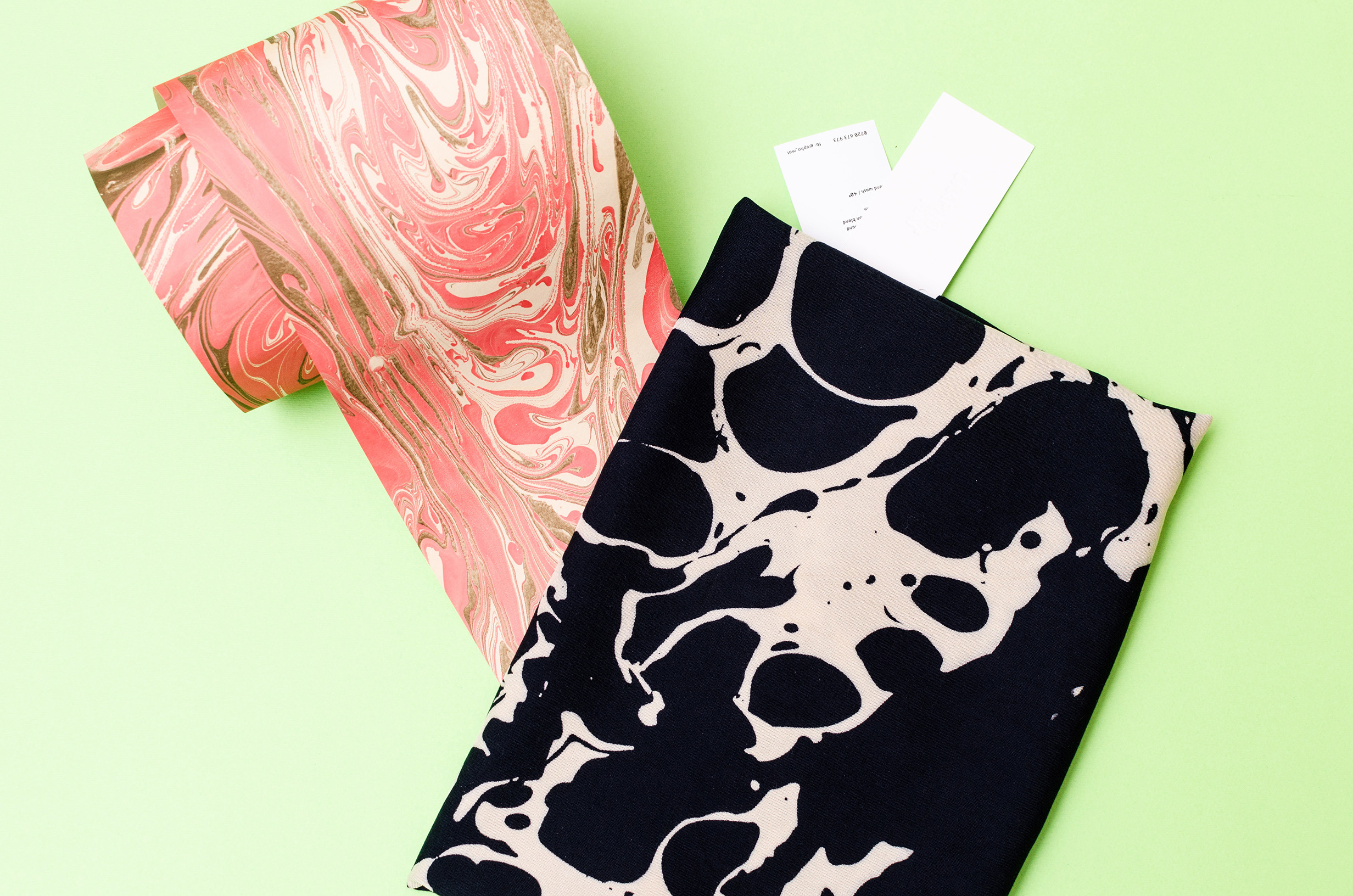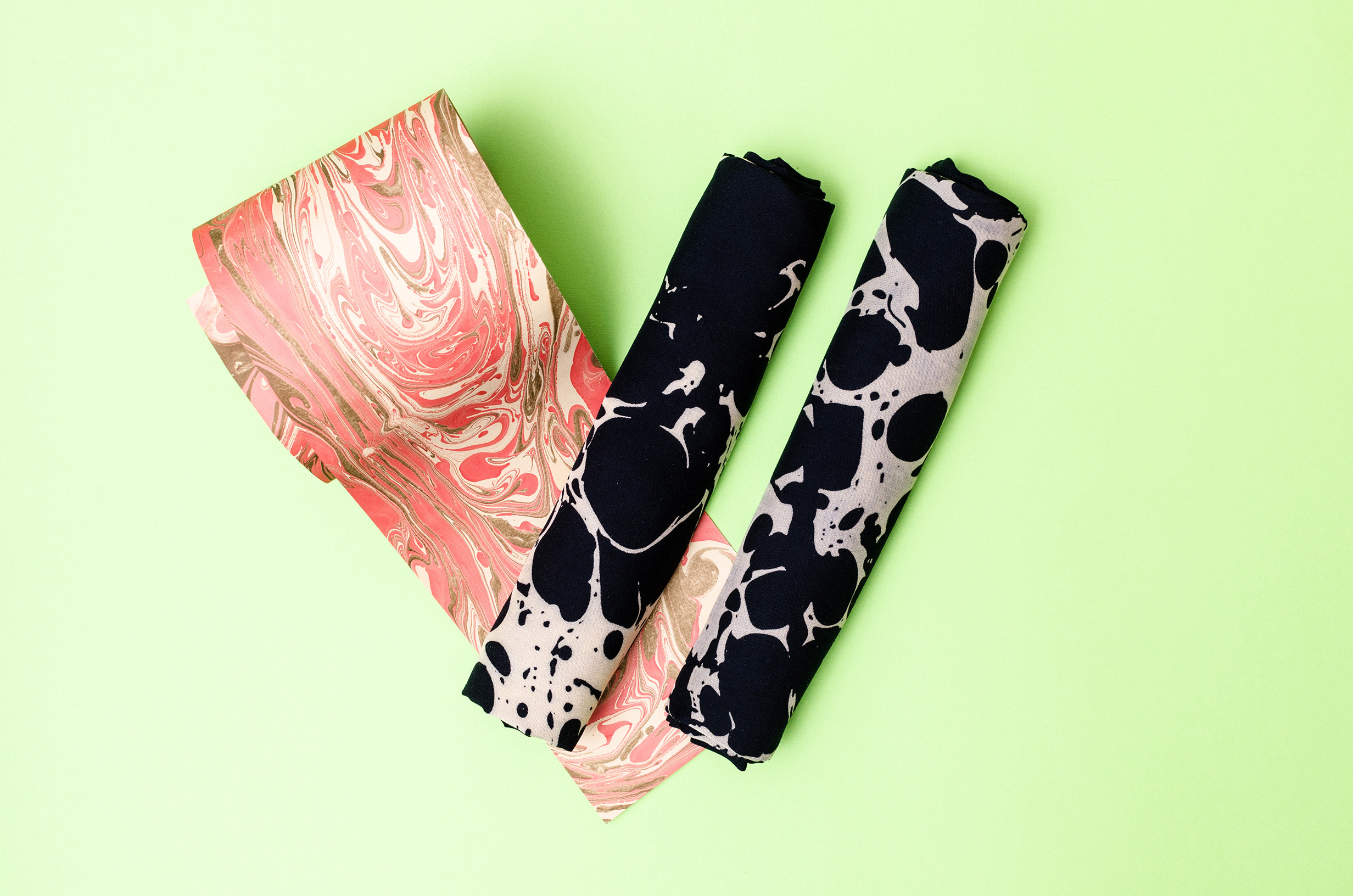 The marbled scarf is inspired by our project “marbling paper” used for notebooks covers. The design is an interpretation of one of our papers and screen printed on textile.