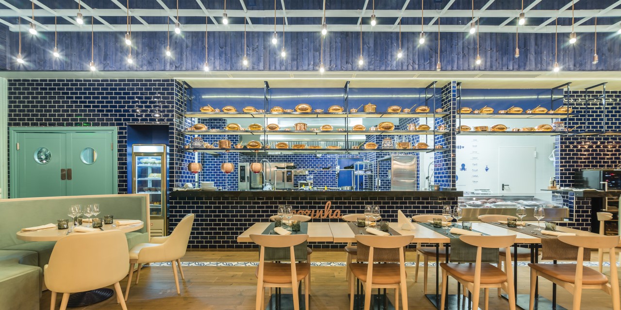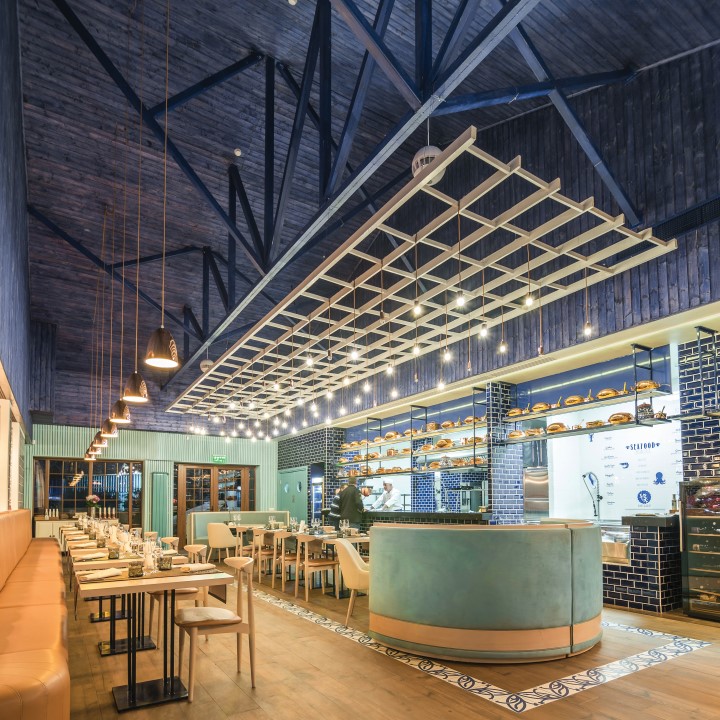 In this new seafood restaurant situated in Bucharest, deep blue stands as a focal point and inspiration. The marine inspired aesthetic is echoed in the glossy walls, blue and white azulejo tiles and various sea motifs that complement the interior.