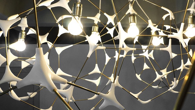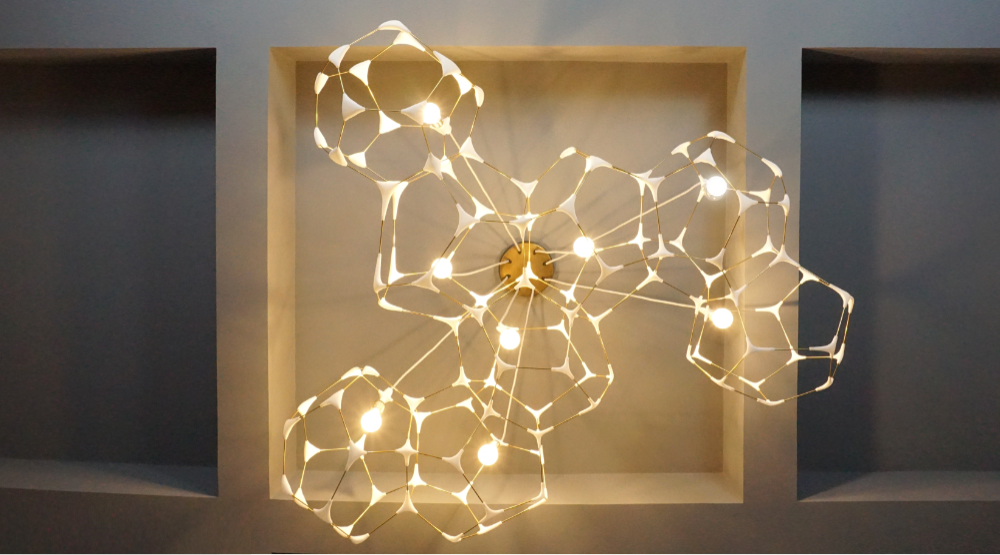 The Aggregate Cells luminaires are born from a process based on feedback between concept, geometry and material, all of which are translated into code. The shape, material and method of materialization bear the fingerprint of the digital environment; thus, the filiform and porous structures are generated using computation and made by 3D printing in ABS plastic that are manually assembled using brass pipes and accessories.