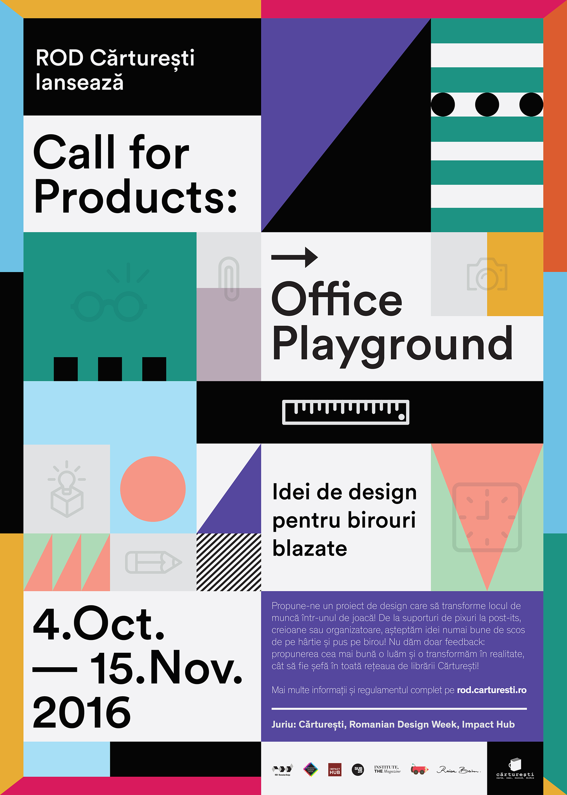 ROD Cărturești a lansat un Call for products cu tema "Office Playground", pentru a scăpa birourile de plictiseală și pentru a le transforma în loc de joacă pentru idei de design. Neaoșe, simpatice și utile, pentru creativul de la parter sau adresate contabilului-șef, ROD Cărturești așteaptă propuneri de obiecte de design pentru un birou eliberat de hârtii.