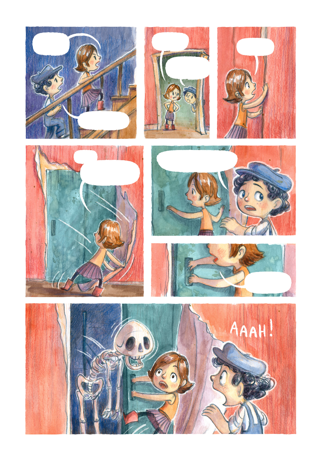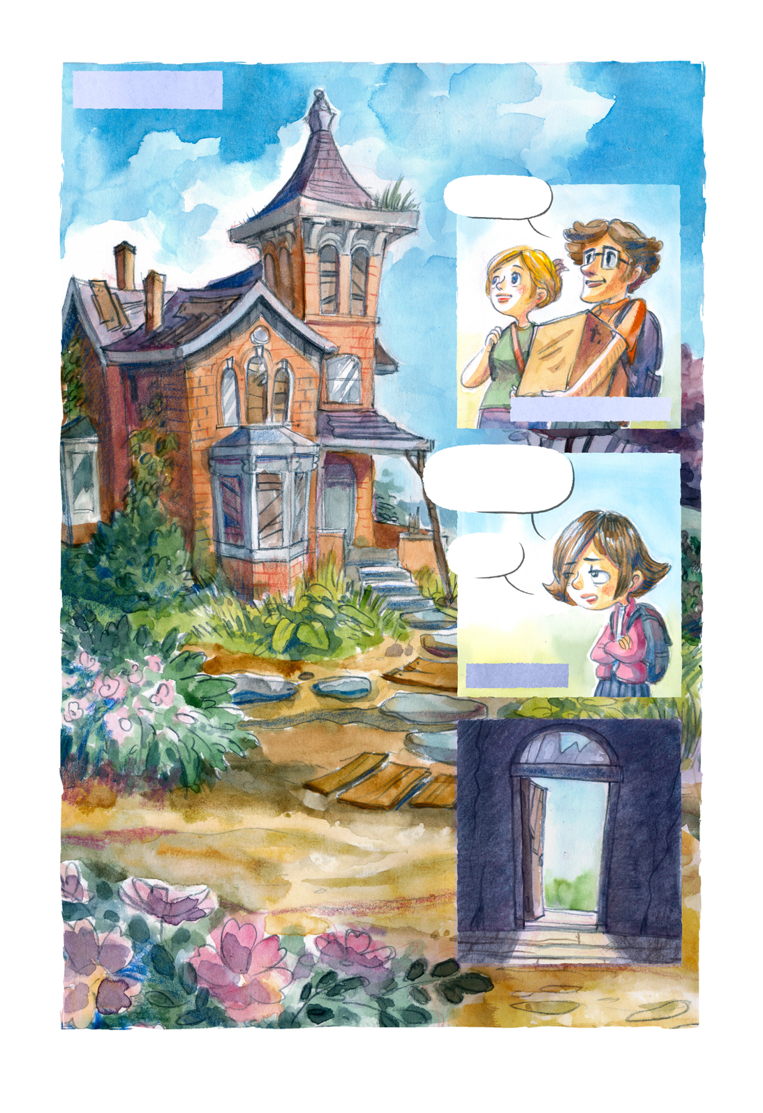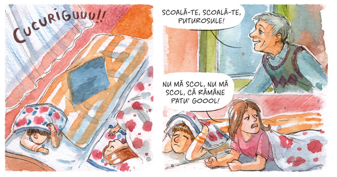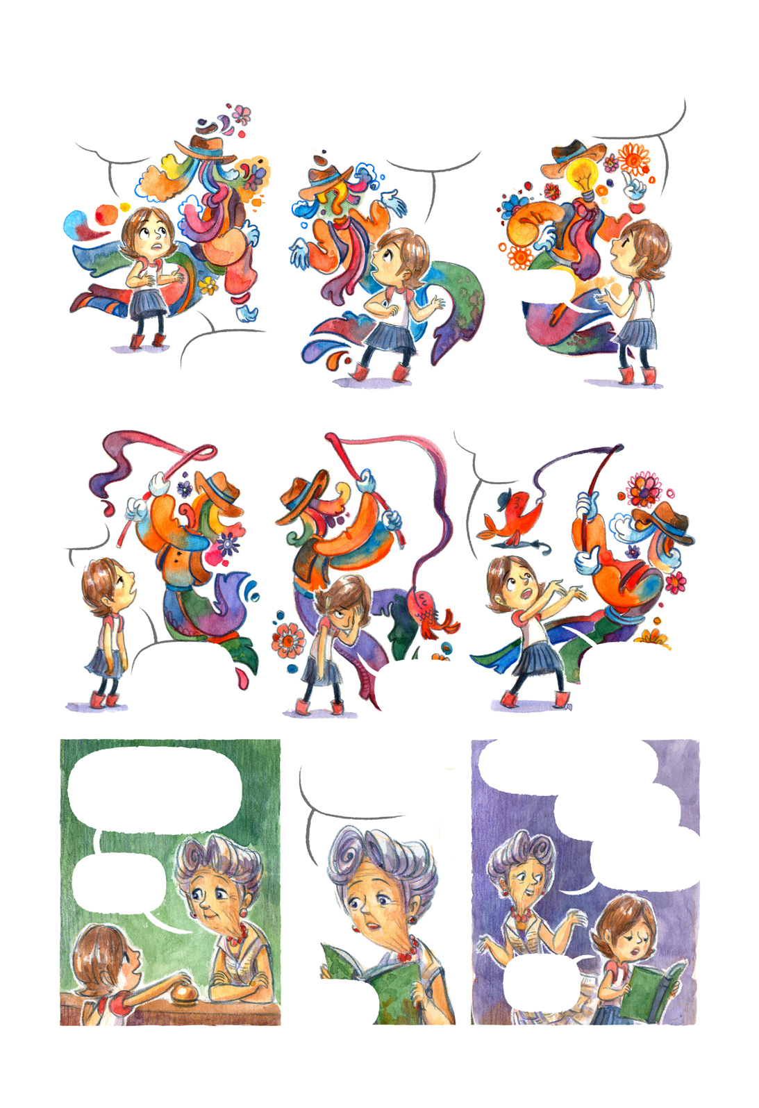 The drawings were made in a traditional manner, with colored watercolors and pencils - then scanned and processed on a computer. The images were designed to allow for a smoother integration of text - digitally added along with the speech bubbles.