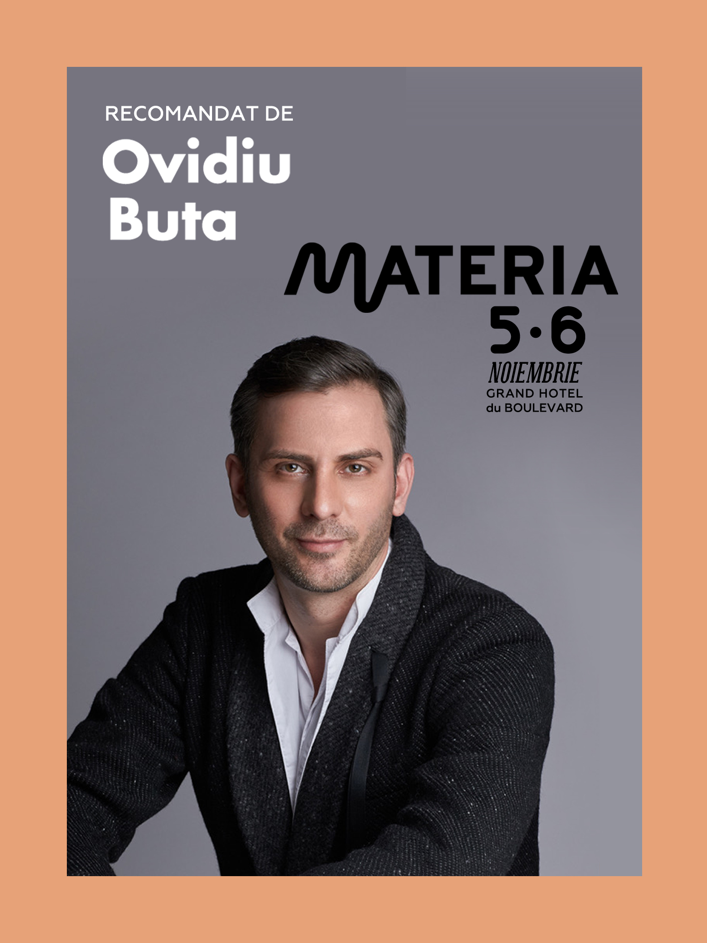 O altă noutate marca MATERIA este participarea unuia dintre cei mai cunoscuți stiliști din România, Ovidiu Buta, în prima zi a târgului, pe 5 noiembrie. Acesta va alege din obiectele celor 45 de designeri participanți și le va integra în categoria “Recomandat de Ovidiu Buta”.