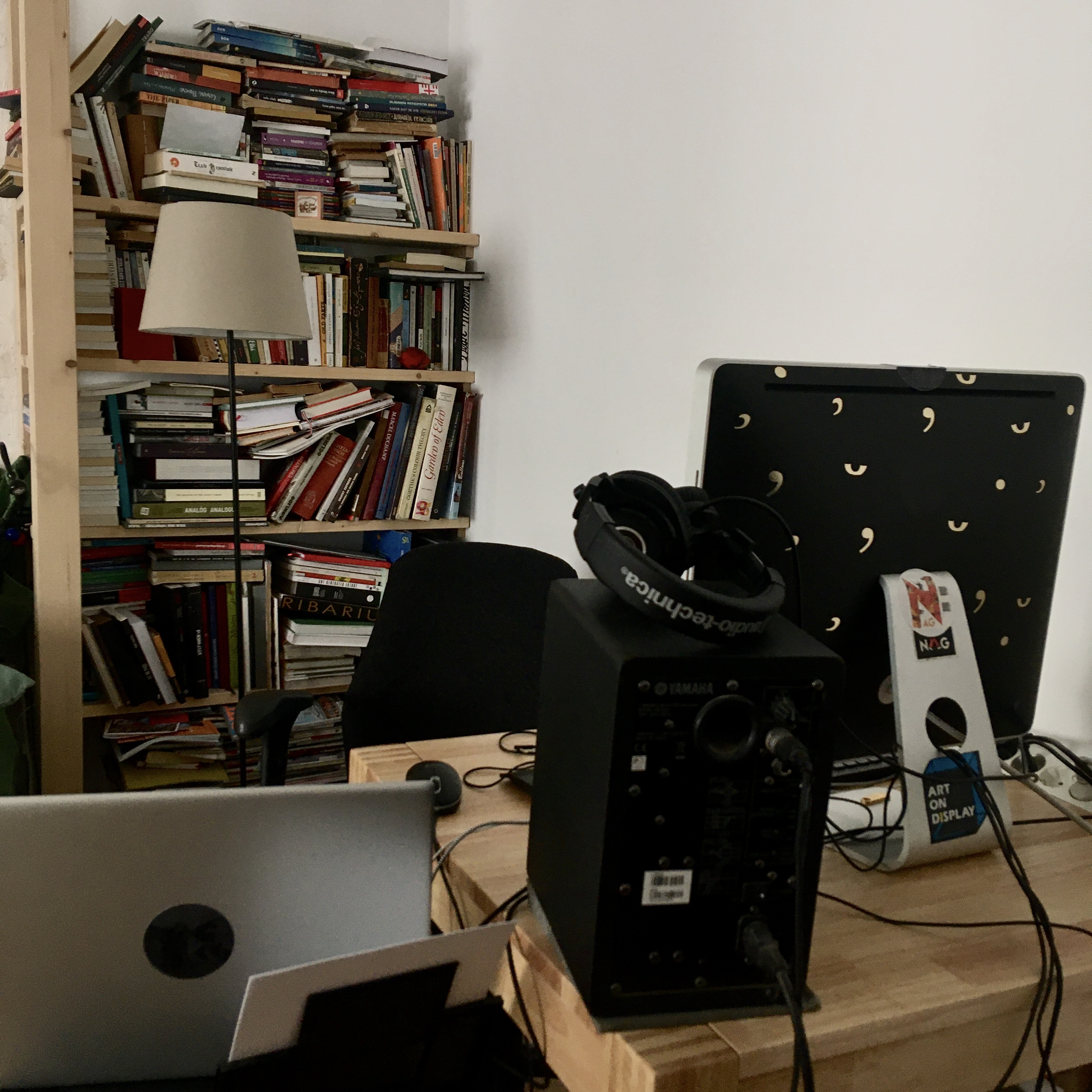 Acesta este biroul meu de acasă. Oricum migrez cu el din loc în loc, dar pentru moment am pus bazele lui în acest colț de cameră.