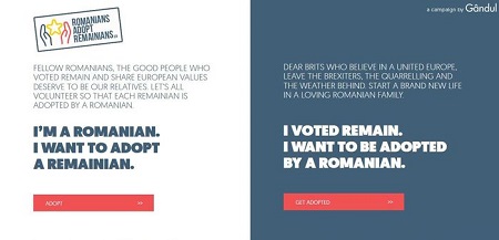 Din nou în prezentul post Brexit, aceiași Gândul, GMP Advertising & Webstyler provoacă românii la un exercițiu de solidaritate și susținere a britanicilor pro UE prin campania “Romanians adopt remainians”. E un gest simbolic prin care puteți adopta un britanic care a votat nu la referendum.