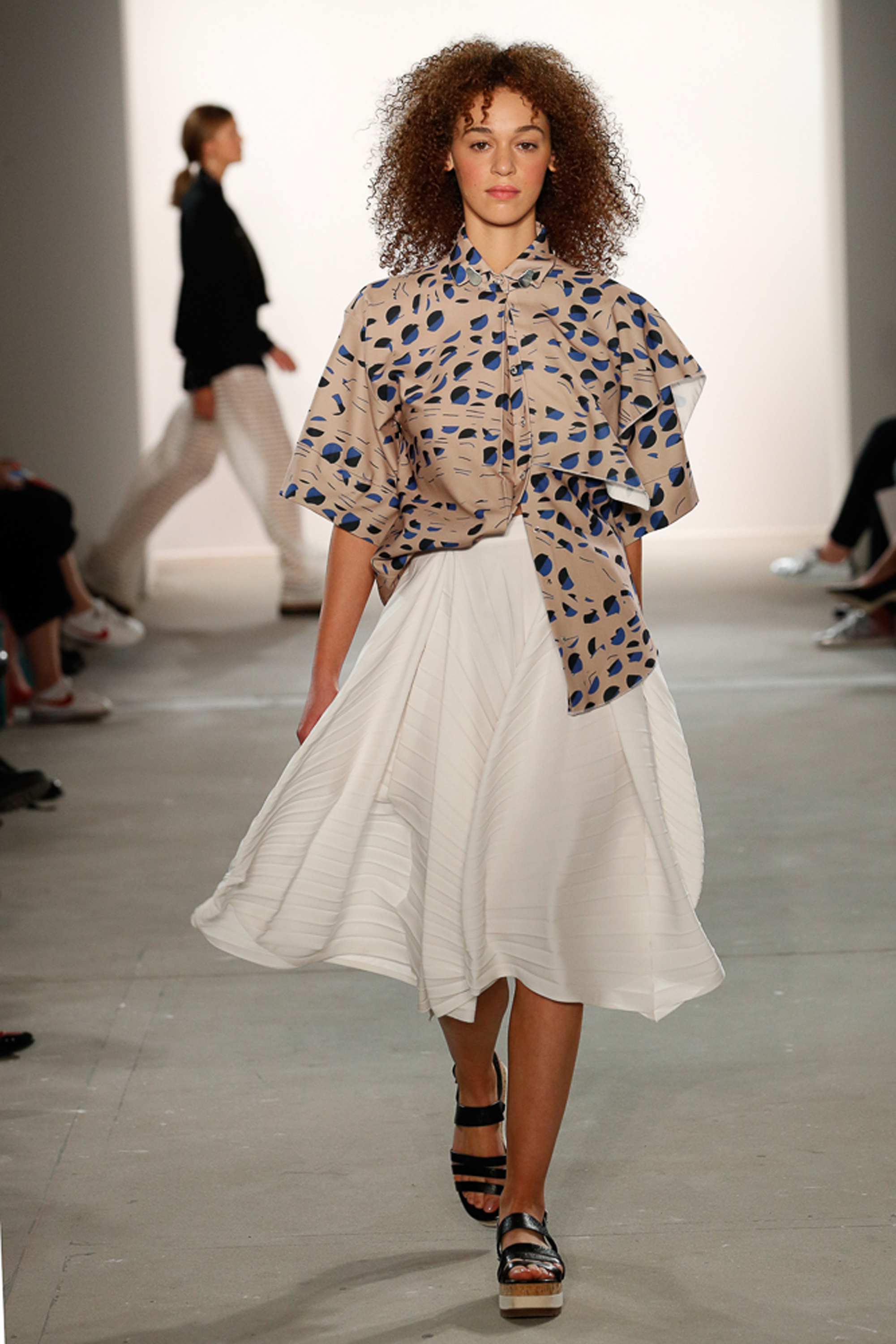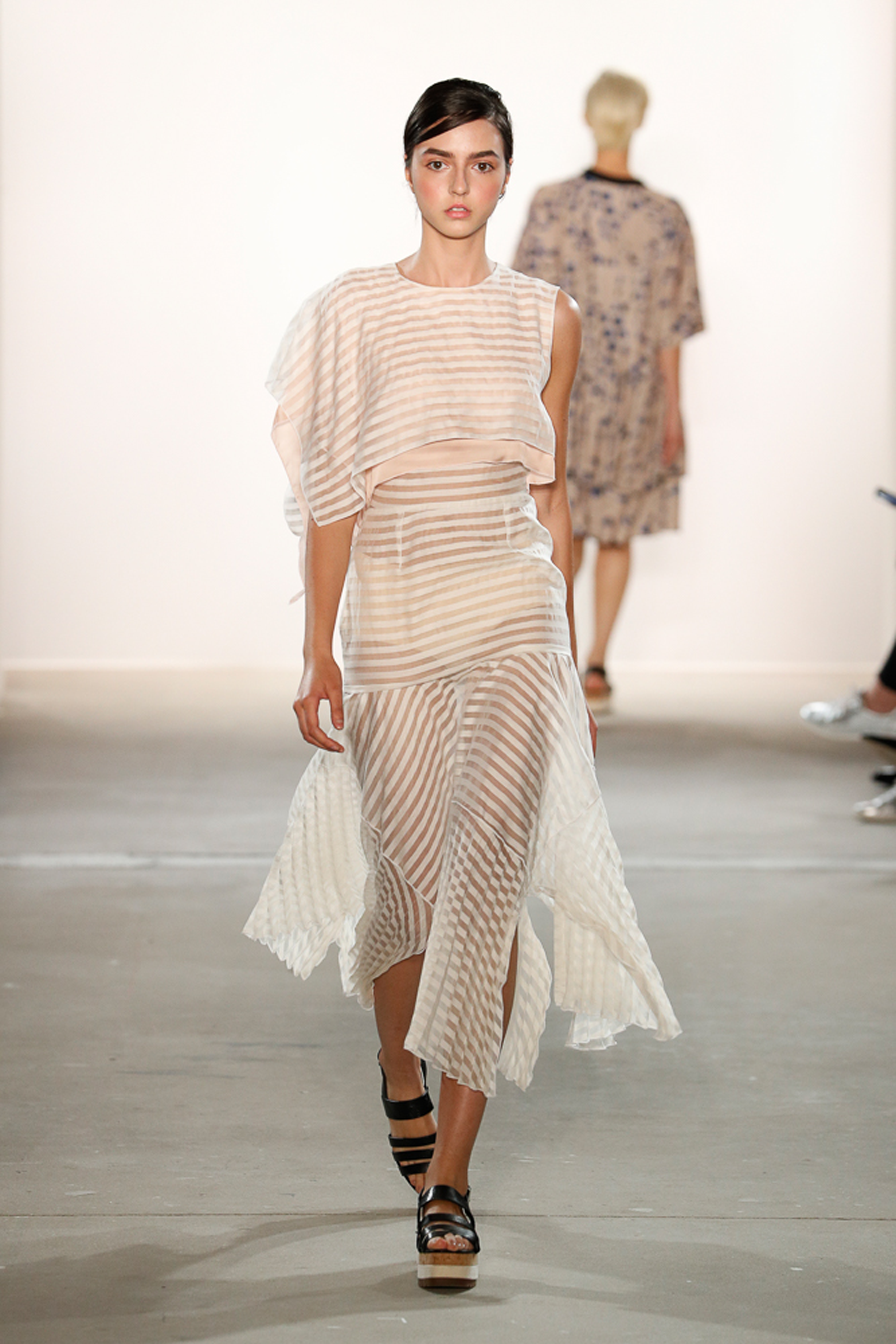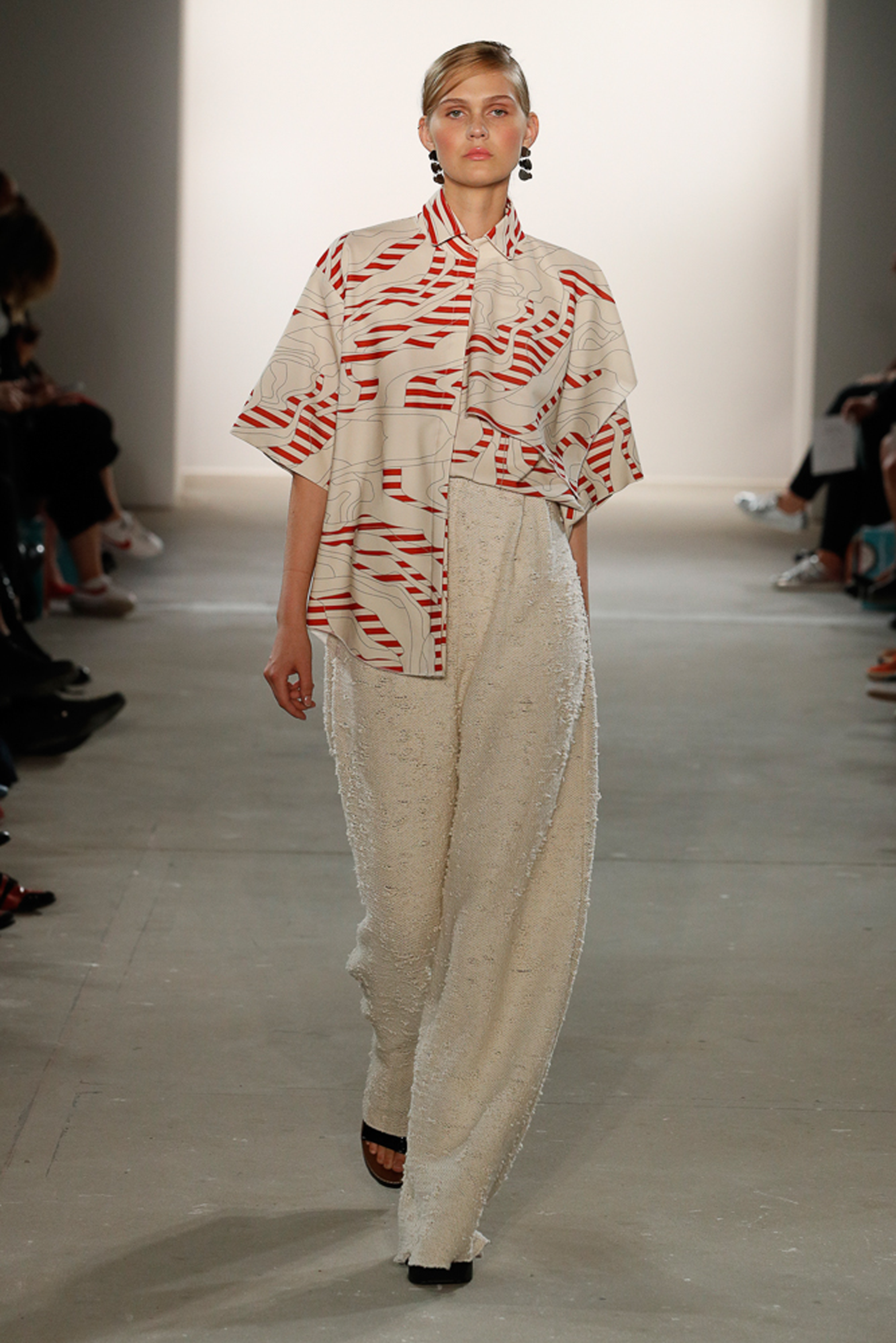 Emphasized proportions are interrupted by delicate classic cuts. Disrupted proportions are emphasized by unexpected contrasting texture layering. Soft hues enhance the rich color panels in controlled construction. Fabric use is focused on fluid, texturized and graphic plays with sustainable recycled silk and wool, shred like summer knits and precious metallic knits.