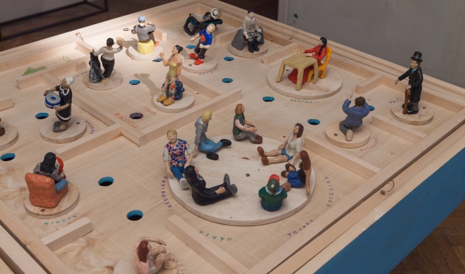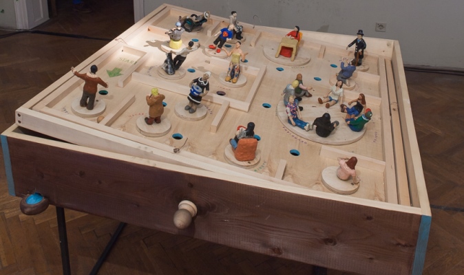 Pornind de la aceste idei,am realizat un joc de tip labirint, ce conține o bilă care parcurge un traseu bine definit și atent etapizat. De-a lungul drumului, bila întâlnește o serie de personaje, ce au fost selecționate în ordine cronologică. Ultimul personaj, amplasat la finalul jocului, este un autoportret. Autoportretul semnifică ajungerea la destinație, acel aici și acum la care se ajunge prin parcurgerea traseului în ciuda obstacolelor întampinate.