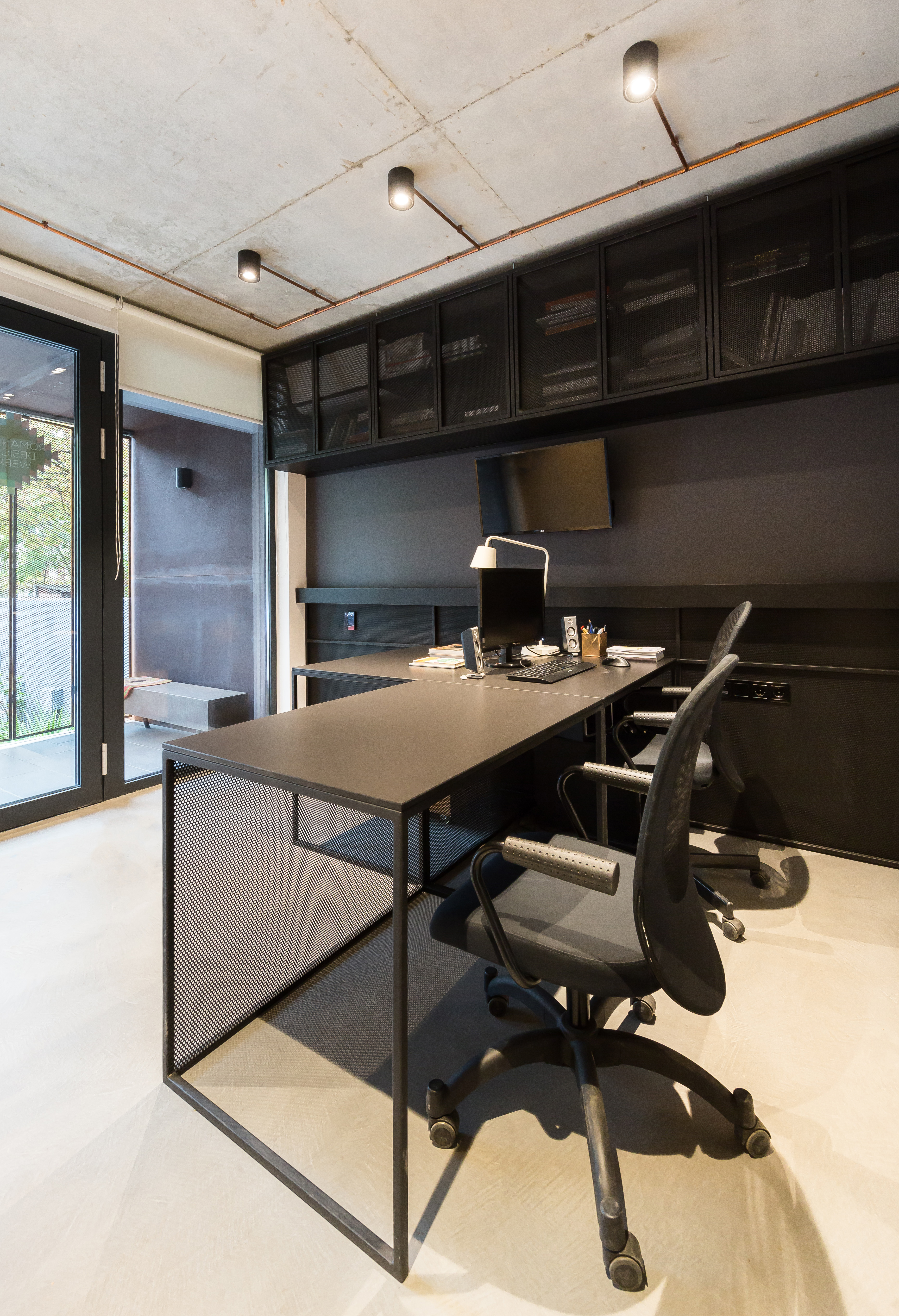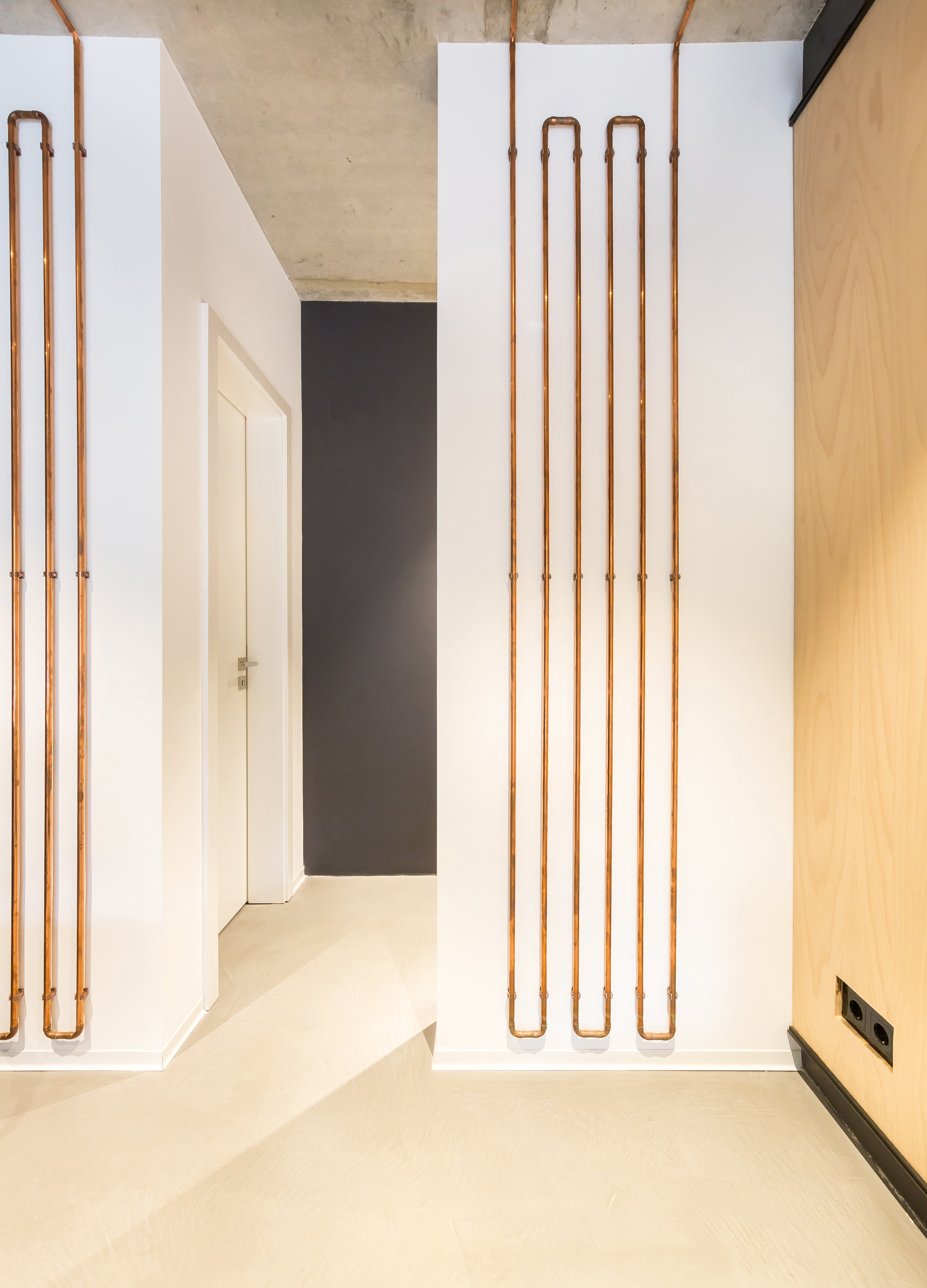 This studio space was arranged for a young team whose work and concern is the interior architecture and design. Thus, the team has implemented its principles in its own workspace. This office is part of a home, in fact it is the space of the former garage that was demolished and rebuilt according to the new needs. Above the deck there is a green terrace. The space is limited to only 16 sqm, but hosts three office units. The furniture was customized and executed for this space. The finishes used: concrete, metallic constructions, beech plywood, copper pipe, are meant to suggest sincerity, simplicity and unconventional. The copper pipe that hides the electrical installation represents the symbol of good communication. These natural materials, left in their natural shape, are the materials IUstudio team uses and promotes in its projects. The ambience with a slight austerity and modesty was the stylistic objective of this interior design.