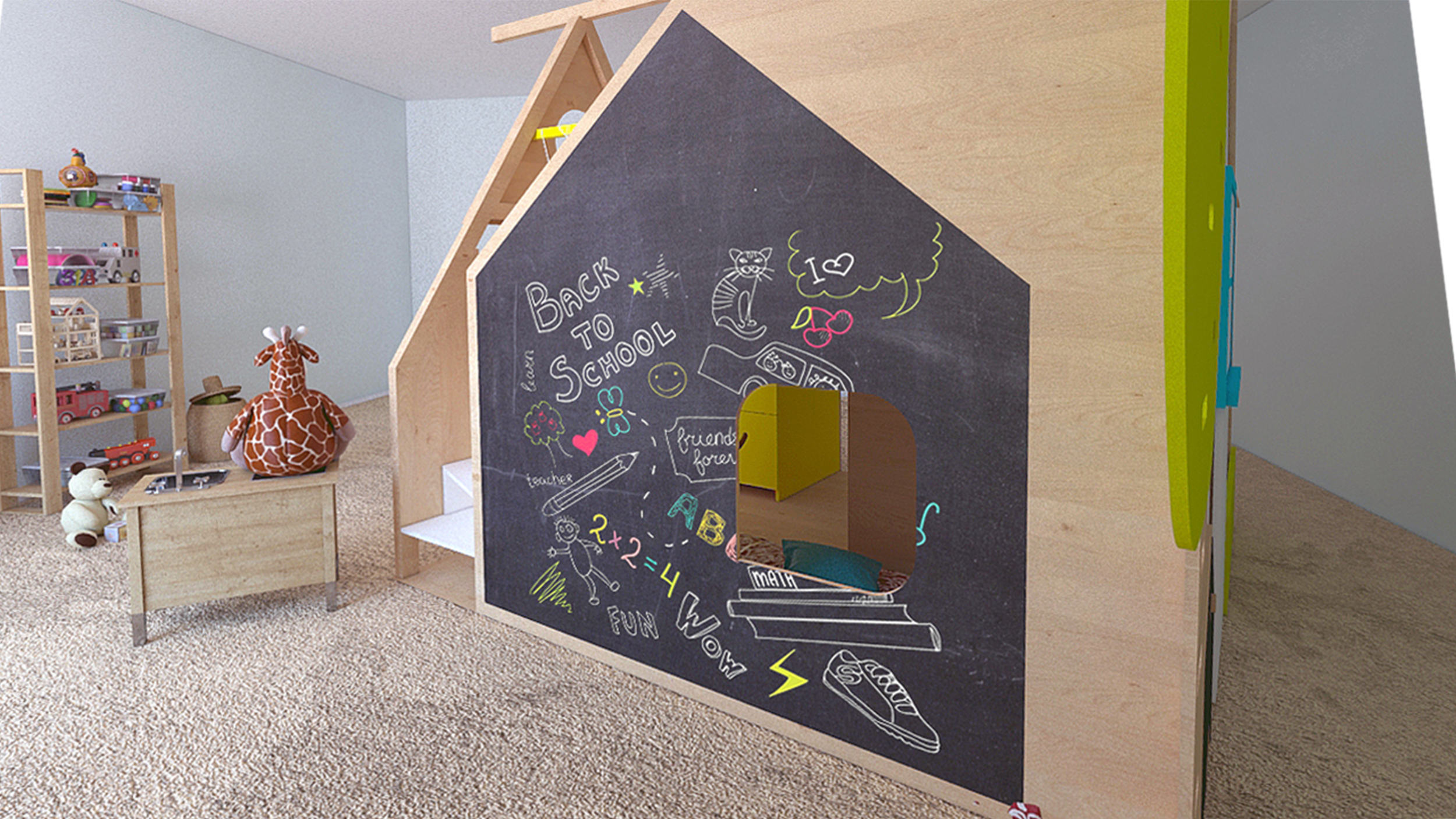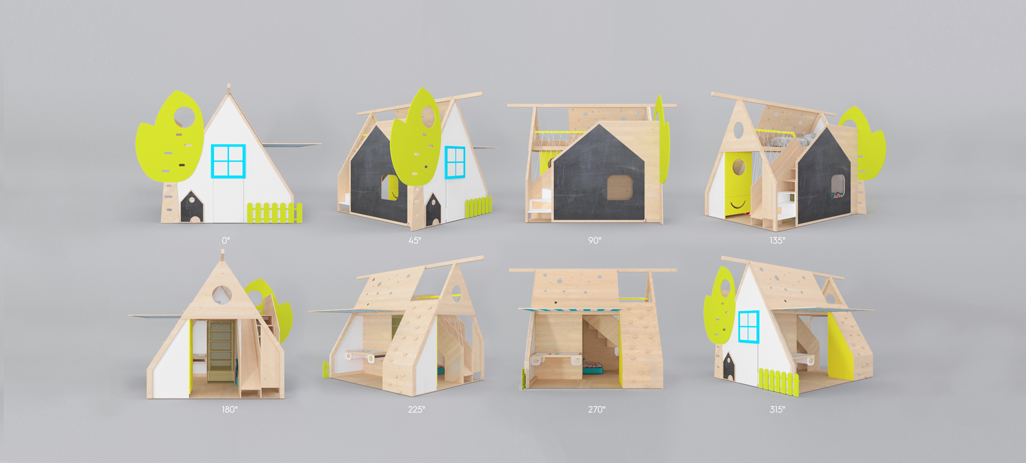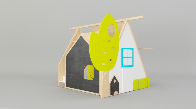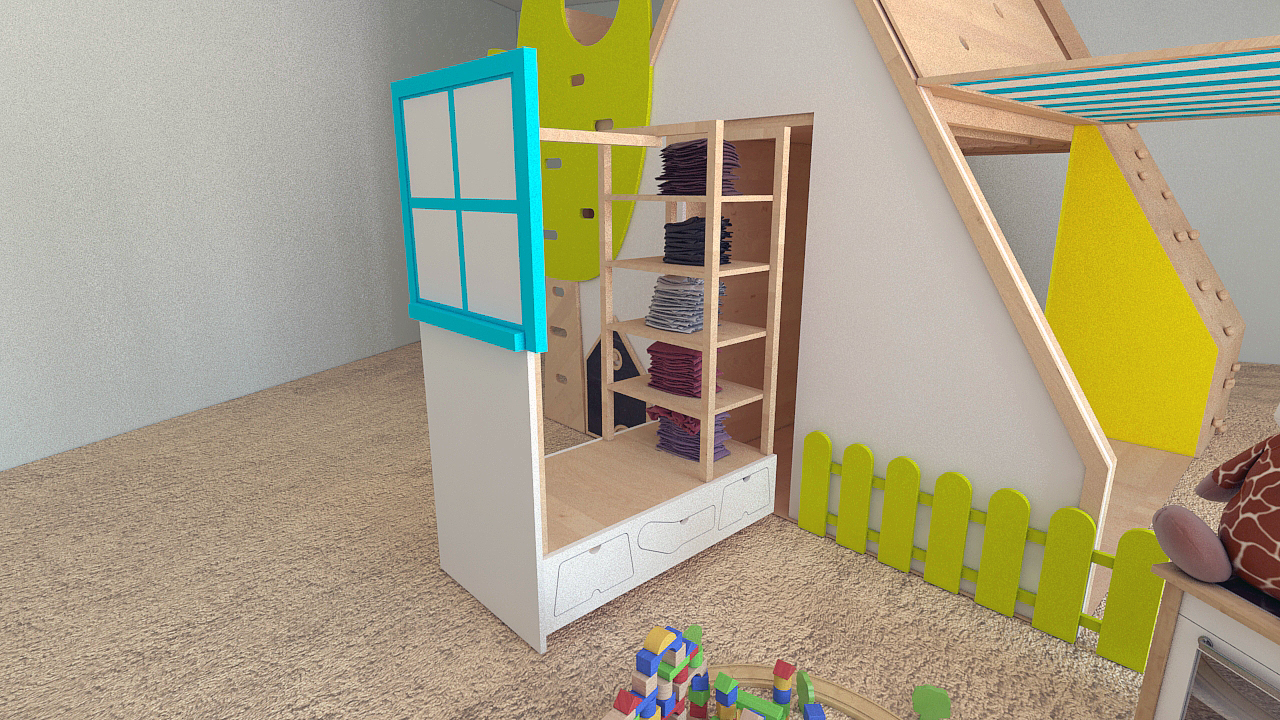 The furniture offers two 140/70cm beds, a slide, a blackboard, a storage space for toys with a mobile drawer/wagon with wheels, integrated bed lighting in star shape, a portable lamp which can be located in different places, climbing wall, mobile wardrobe, folding house, drawing desk with integrated paper. The upper floor is thought as a tree house and the access to it, is either on its trunk with an entrance through the crown or on the sliding ladder. The furniture was designed for the children's room but being a modular concept, it can be adapted to small, large indoor or outdoor spaces.