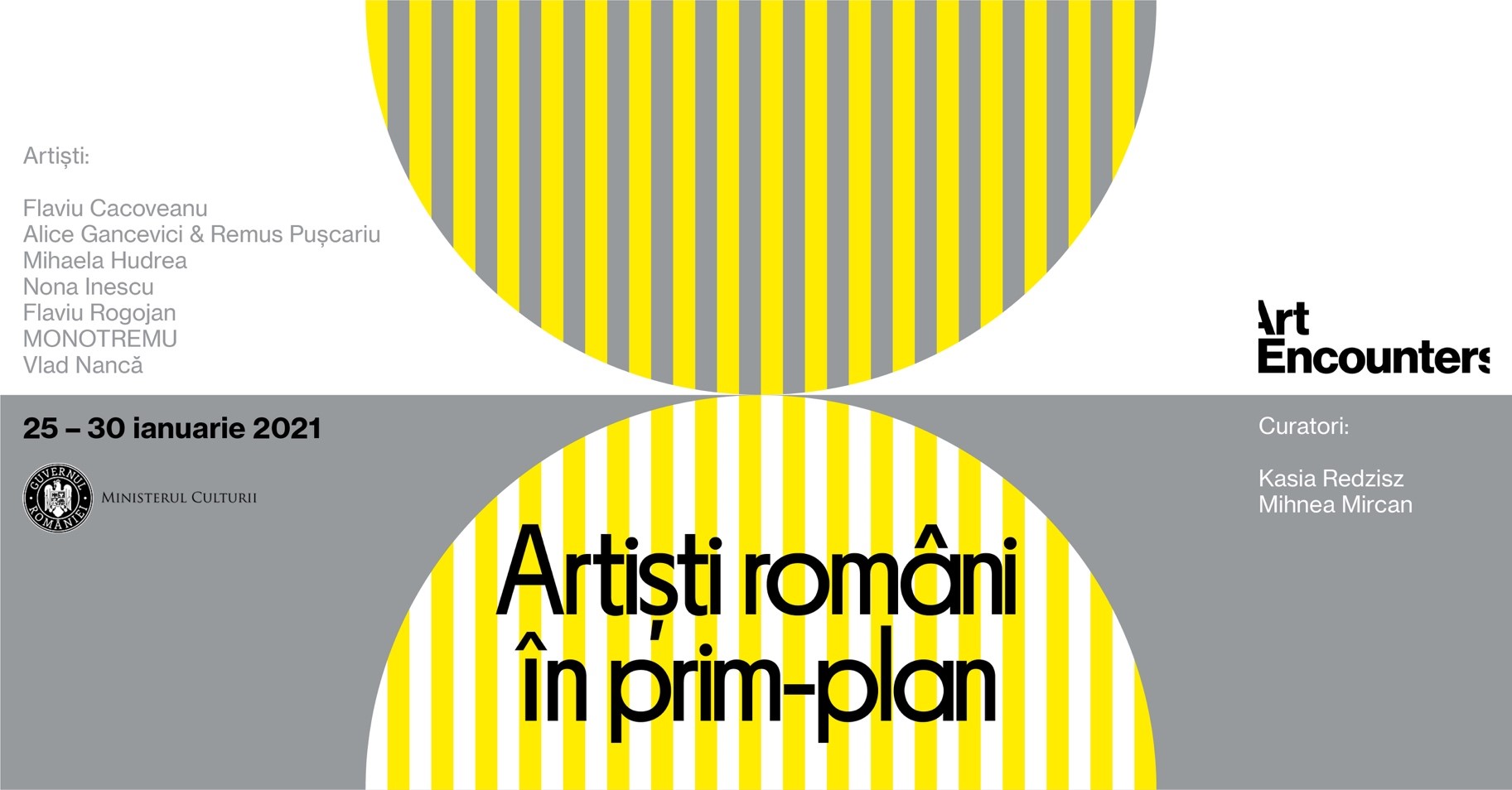 Fundația Art Encounters din Timișoara organizează evenimentul de lansare a celei de-a patra ediții a Bienalei Art Encounters prin proiectul Artiști români în prim-plan, care se va desfășura în perioada 25-30 ianuarie, online pe Facebook și pe website-ul Art Encounters. Publicul îi va putea cunoaște pe curatorii acestei ediții, Mihnea Mircan și Kasia Redzisz, dar și pe o parte dintre artiștii români invitați: Flaviu Cacoveanu, Alice Gancevici & Remus Pușcariu, Mihaela Hudrea, Nona Inescu, Flaviu Rogojan, MONOTREMU, Vlad Nancă.