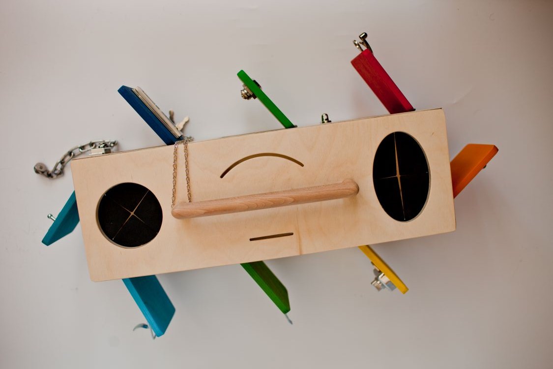 Is a multiple colored doors and locks box designed to be attractive and to support multiple functionalities, created for the use of children 7-8 months to 4 years of age. The box, through its shape, color and accessories, naturally attracts children. The doors and locks are great for fine motor development of the hand, the multiple access in every drawer develops the understanding of volumes and space, the camouflaged openings in the superior walls make possible the insertion of other toys and help the child understand the principle of permanence of objects, and allow playing the game of identifying an object only through touch. There are three models of boxes, different in size and complexity.