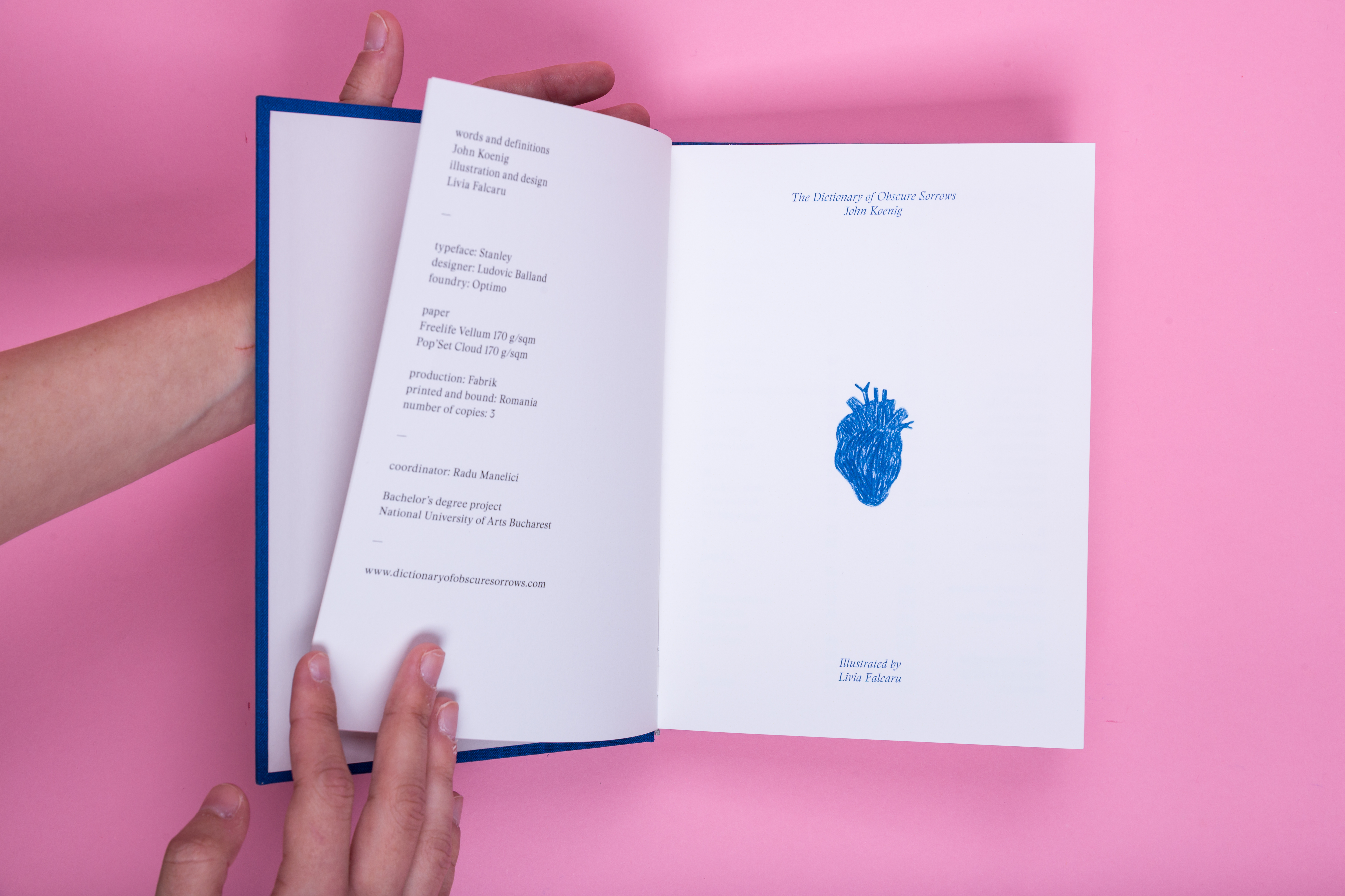 ”The Dictionary of Obscure Sorrows” este un compendiu de cuvinte inventate de John Koenig, menite să umple un gol în limbaj. Ele au fost create pentru a defini senzaţii şi emoţii pe care cu toţii le simţim, dar pentru care nu avem deja o denumire. Dicţionarul conţine o serie de termeni inventaţi de autor şi însoţiţi de ilustraţii realizate de Livia Fălcaru. Acest proiect doreşte să refacă adevăratul înţeles al cuvântului tristeţe (satis, din latină) care, la origine, înseamnă împlinire. Cuvintele din dicţionar nu au fost inventate cu scopul de a intra în uzul zilnic, ci mai degrabă pentru a reuni singurătăţile care au ca numitor comun anumite trăiri şi amintiri.