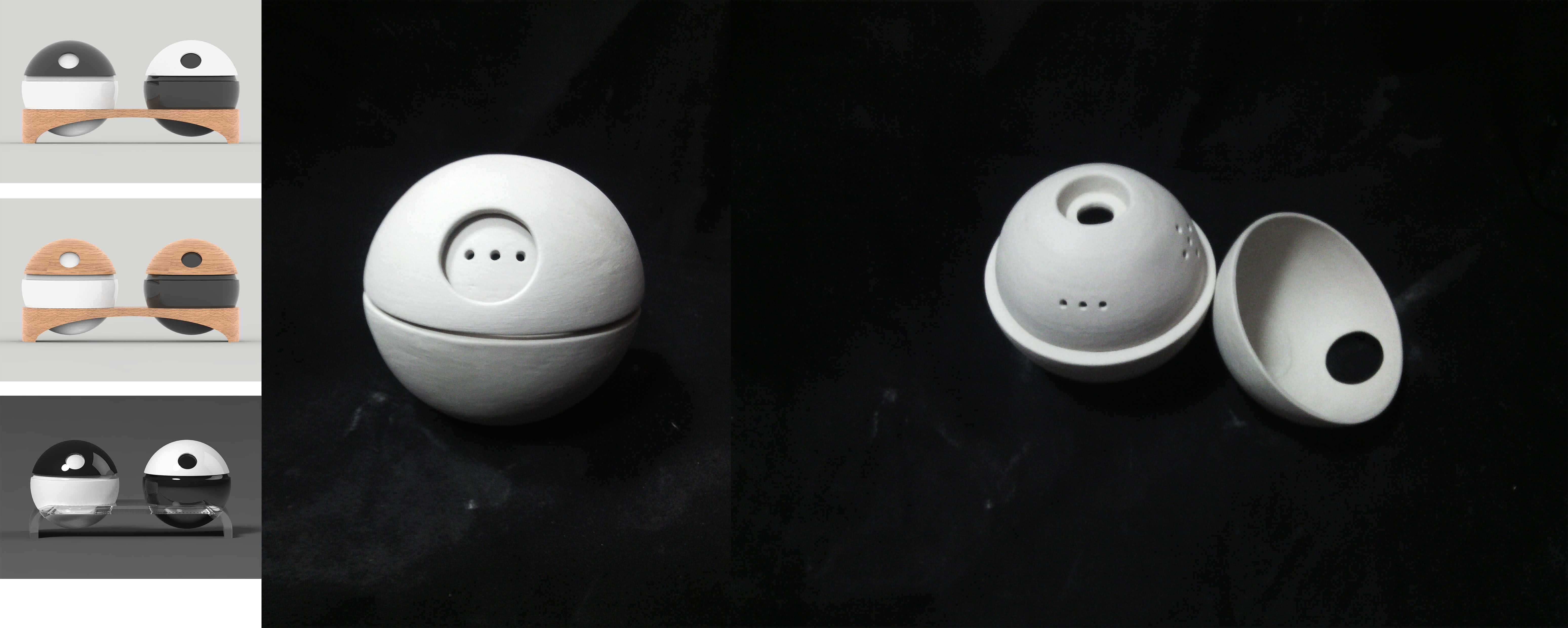 M-smile is a set of salt and pepper shakers made of porcelain. The spherical shakers are composed of two main parts :the recipient for spices and the cap. These two components are linked with two neodim magnets. The spherical shape was inspired by little creatures cartoons and it invites you to play with them.