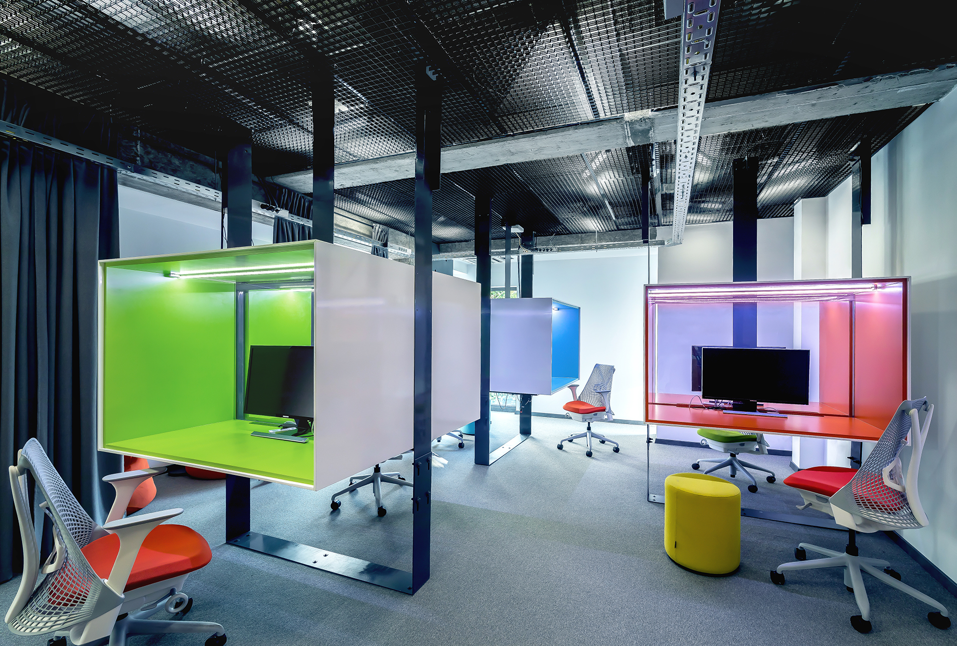 All floors have a coherent image and a sense of identity, with an open-space model, adopted to suit the narrow floors. Focus-oriented work stations & intimate spaces were embedded throughout. To mitigate the effects of office routine, the concept stimulates the alternation of work & relaxation, of individual & social activities. Silent is a focus-intensive floor, with various degrees of seclusion. Active floor challenges workplace sedentariness by combining traditional and experimental work & relaxation spaces. The Social floor is a colourful, brightly lit space, designed for creative activities, uninhibited communication and teamwork.