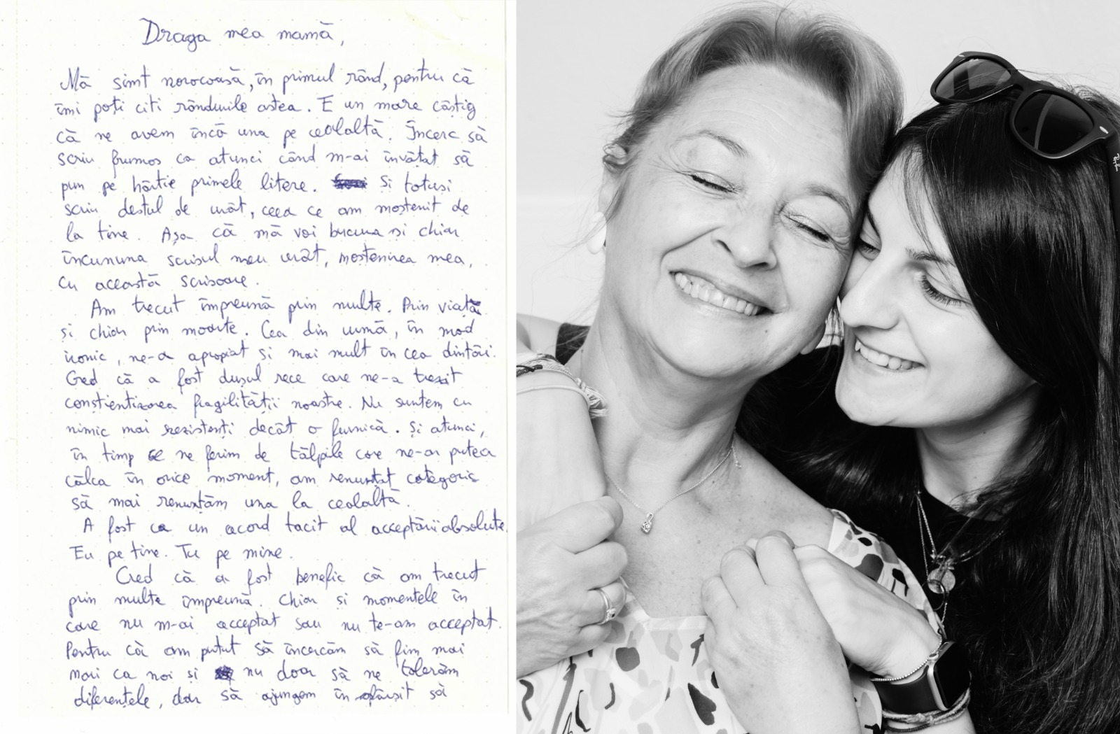„Târziu mi-am dat seama că multe din neînțelegerile noastre se datorează faptului că semănăm destul de tare, lucru greu de acceptat pentru mine acum câțiva ani. Mă bucur sa îți spun ca am ajuns la concluzia ca nu e chiar așa de rău ca iți semăn. ☺ Nu cred că am avut mult timp disponibilitatea și spațiul emoțional să mă uit la tine obiectiv și să trec peste ideile pe care mi le-am format în copilărie, care mi-au produs multă furie. Aia e, nu pot să schimb trecutul și nici nu vreau sa mă mai concentrez atat de mult pe el. Îmi pare rău pentru felul în care ți-am spus multe lucruri, care poate ar fi putut fi spuse mai constructiv. Trecutul ne ajută să înțelegem ce se întâmplă în prezent și cum putem să facem lucrurile mai bine în viitor. Am avut nevoie sa mă uit acolo.” - Anca (36) și Adriana (61)