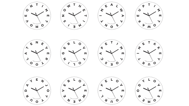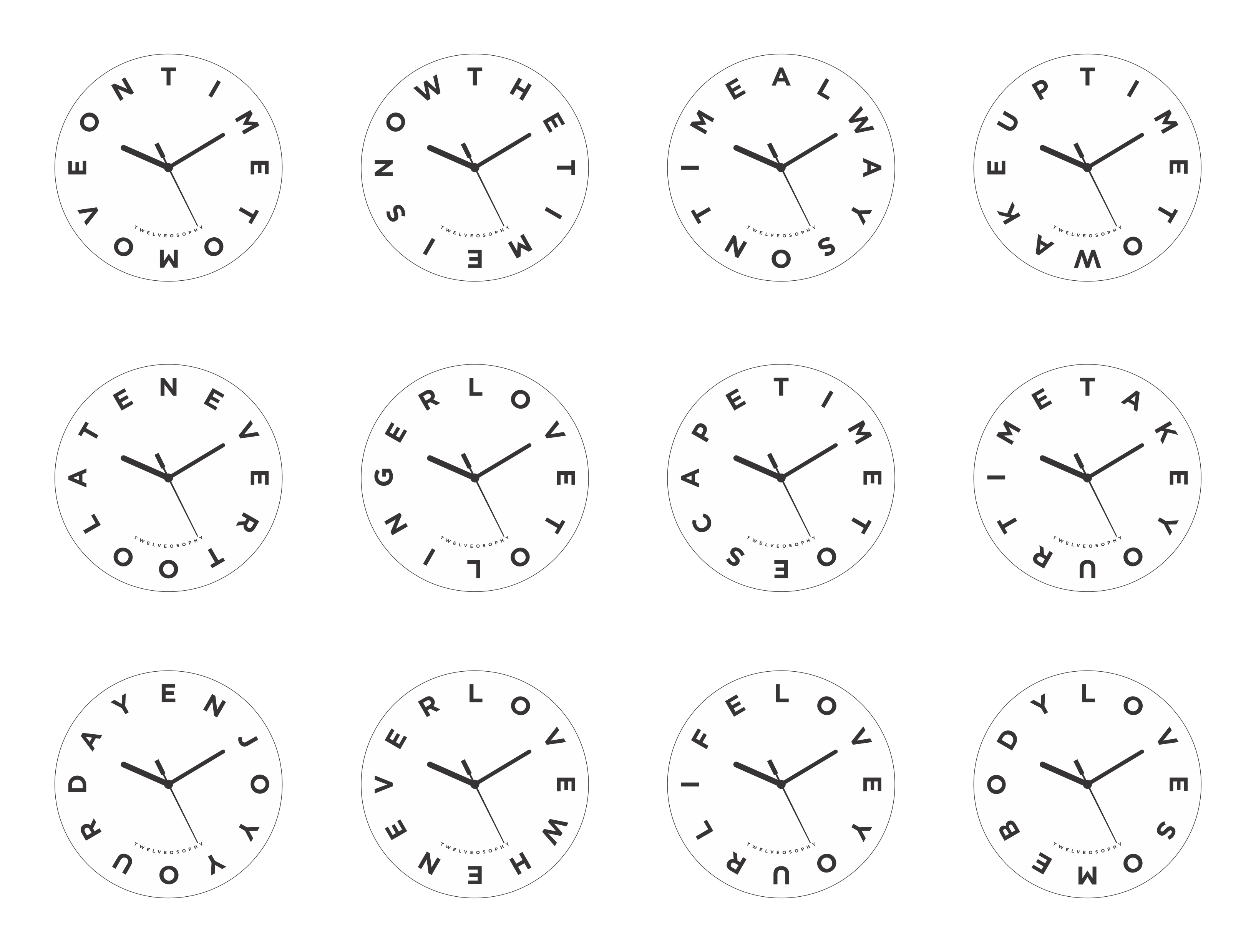 TWELVEOSOPHY offers you the chance to choose what your wall clock should be a reminder of, therefore customizing your relationship with time, considering your values, beliefs or your character. Still, it's not very philosophical. There is either optimism or kindness made out of 12 letter words.
