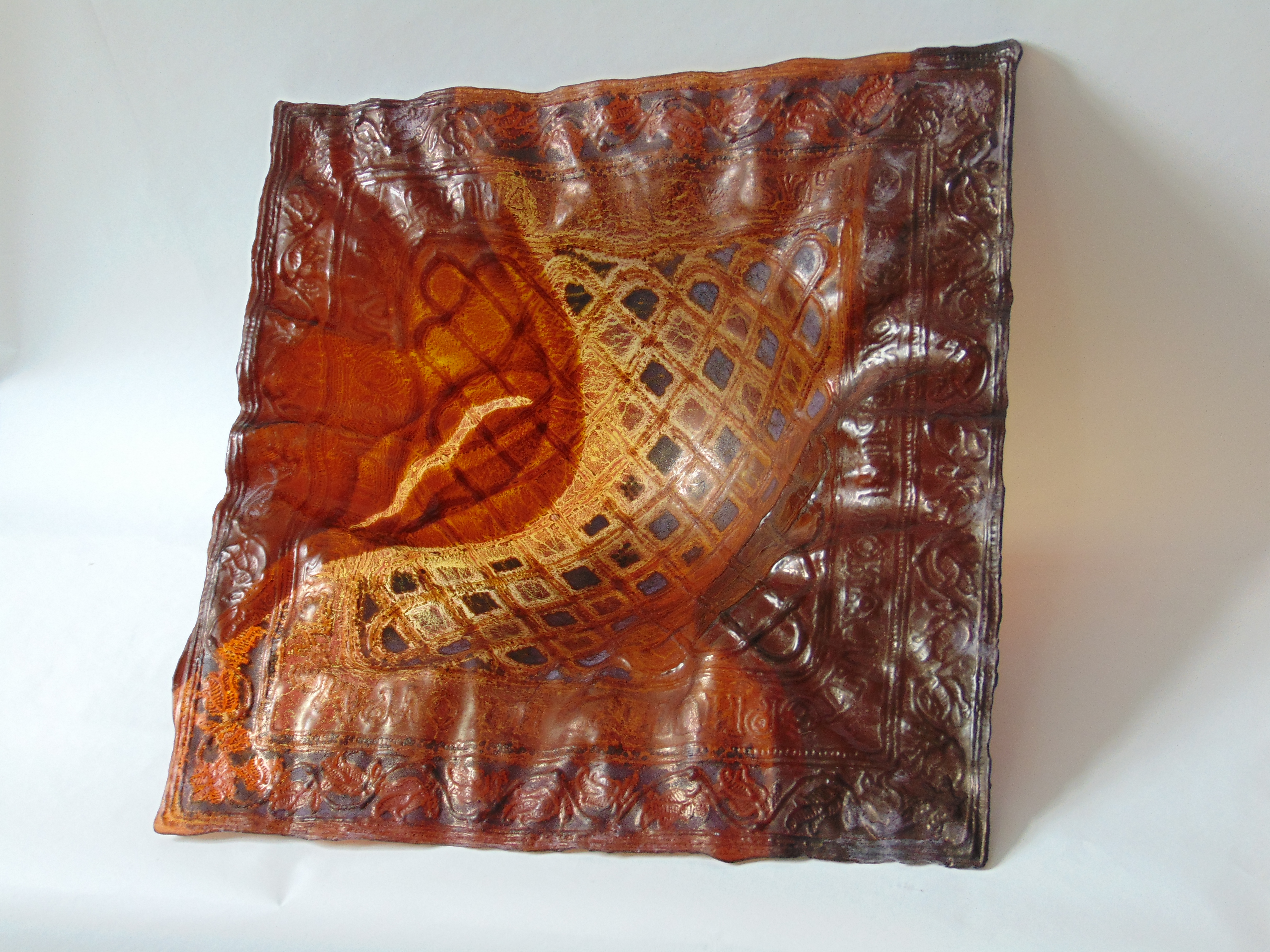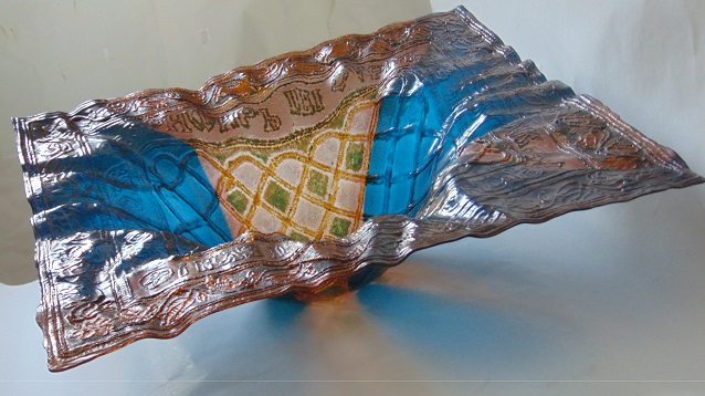 Lucrarea este realizată în tehnica fuzionării. Prin sugerarea și crearea unui material concret, textilul, marcat însă metafizic de lumina care străbate sticla, prin dispunerea culorilor, prin reconfigurarea texturii imprimate în sticlă ca atribut plastic în spațiul bi și tridimensional să poată exista un dialog cu lumea vizibilă printr-un spectacol spiritual-emoțional de lumină și culoare. Propunerea este o o legătură între trecut și prezent, între cer și pământ, între spirit și materie, între sacru și profan, creând o unitate prin expresivitate, plasticitate, formă, simbolistica ornamentală și prețiozitățile cromatice care provin dintr-un fond spiritual profund al artei sacre bizantine. O abordare vizuală nouă prin expresivizarea sticlei regăsită în fibra textilă. Materialitatea este sugerată prin mijloace plastice cu ajutorul vibrațiilor texturii, ornamentației, prețiozităților cromatice, expresivității formei plină de semnificații spirituale. Un dialog între sacru și profan.