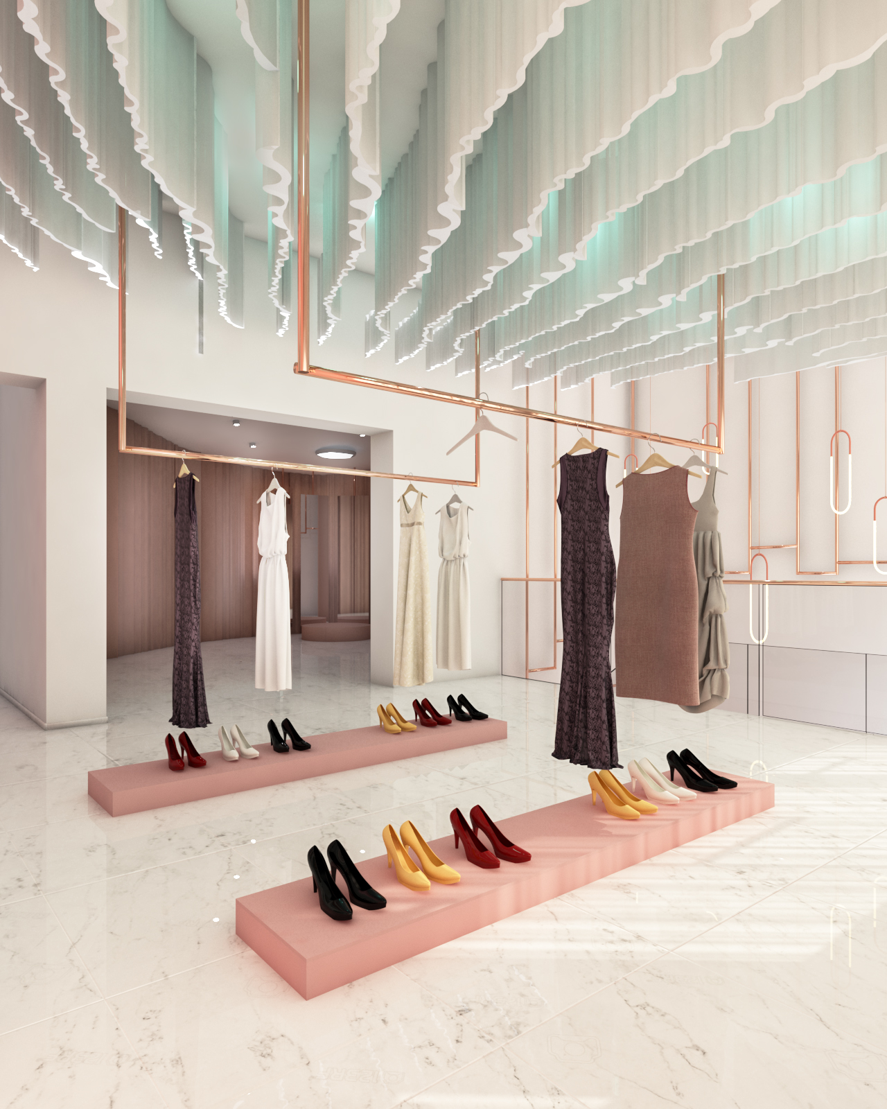 Conceptul amenajării a pornit de la ideea de eleganță și încântare. Am folosit materiale speciale precum marmura, tuburi aurii de alamă și materiale textile precum satin și mătase.Conceptul porneșete de la tuburile aurii care înconjoară pereții zonei de expunere a parterului ce urcă până la etaj și care au rol de suport pentru rochii sau panou de expunere a creațiilor designerului.