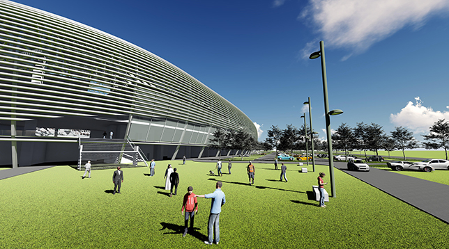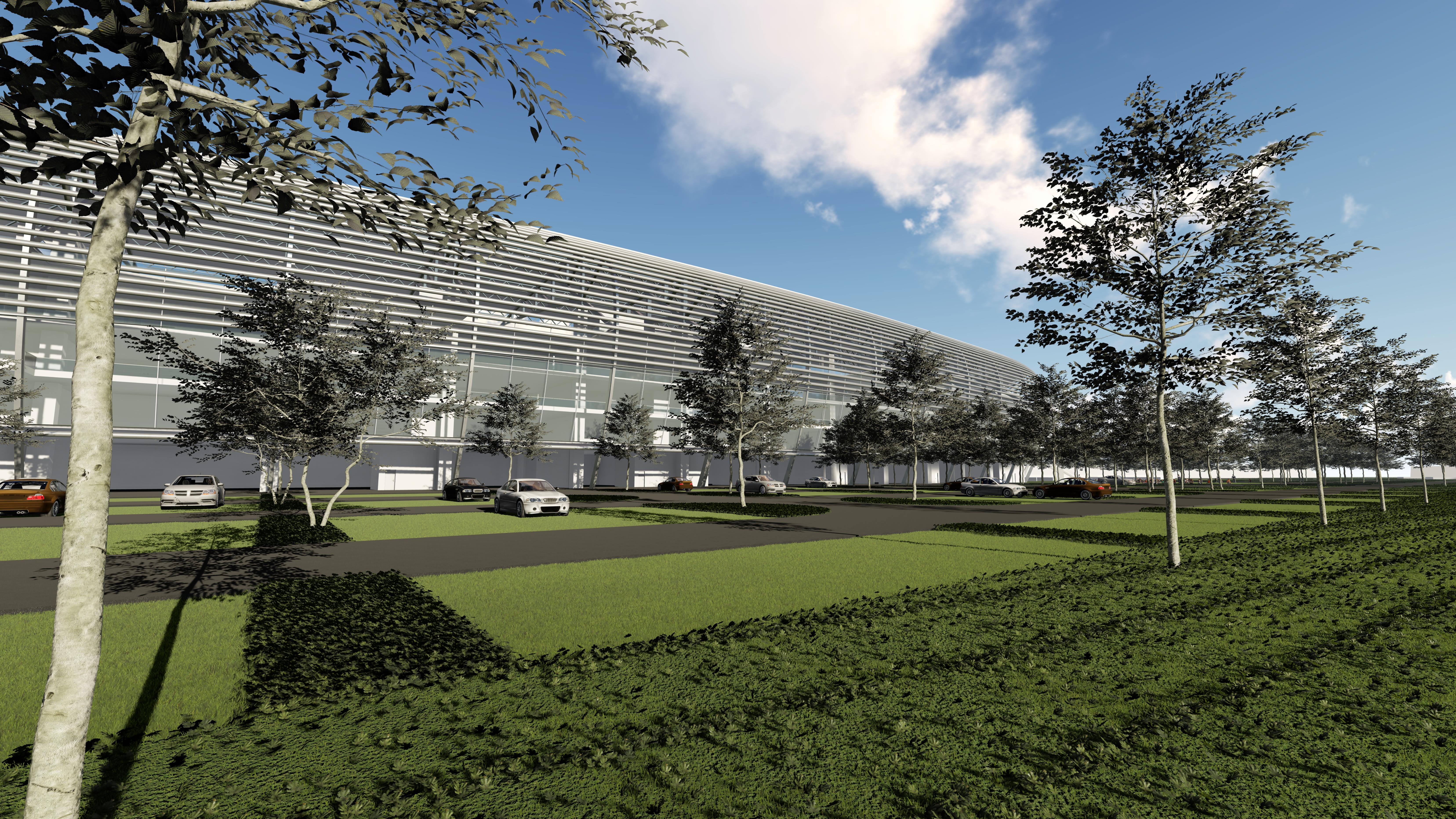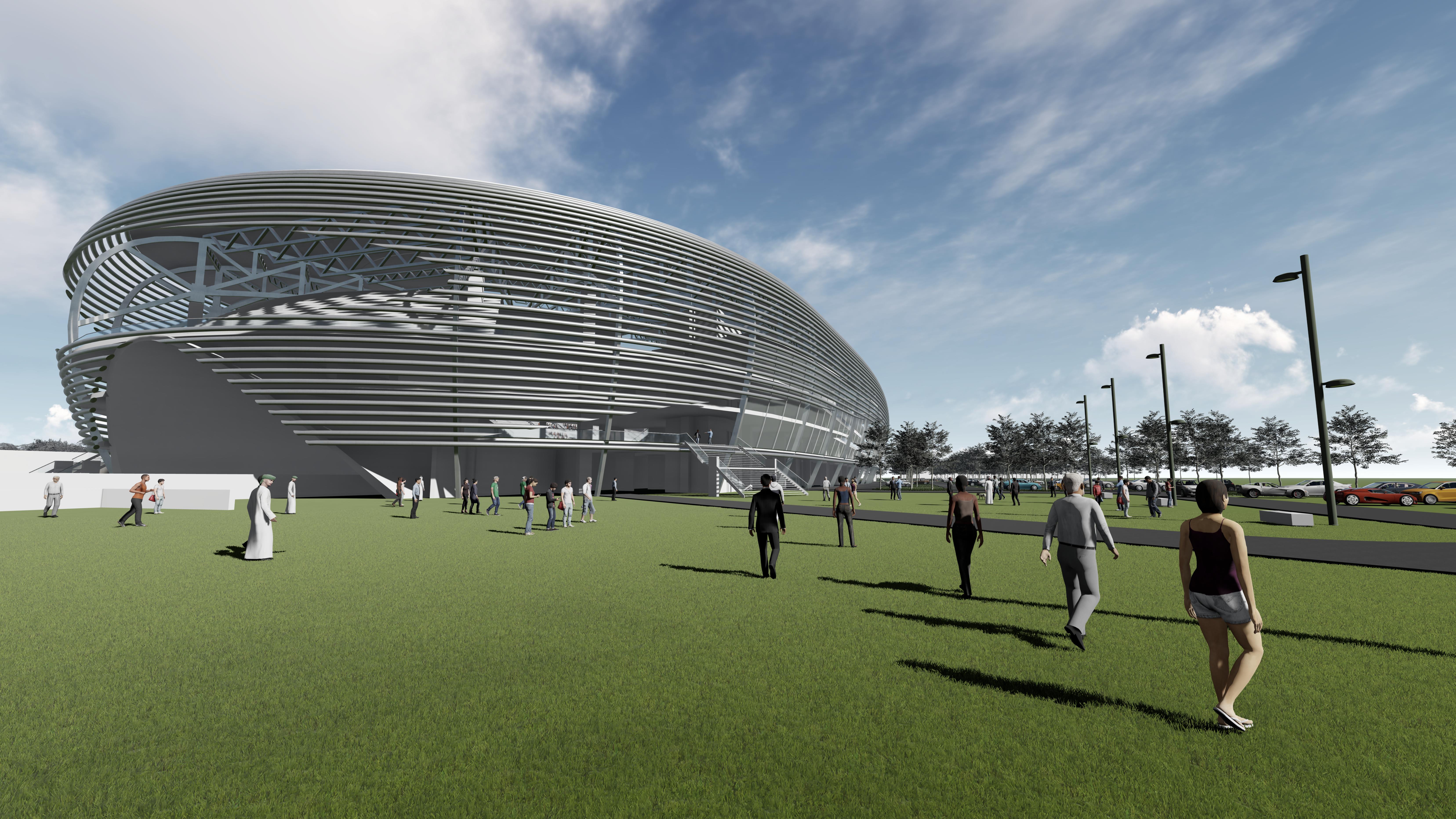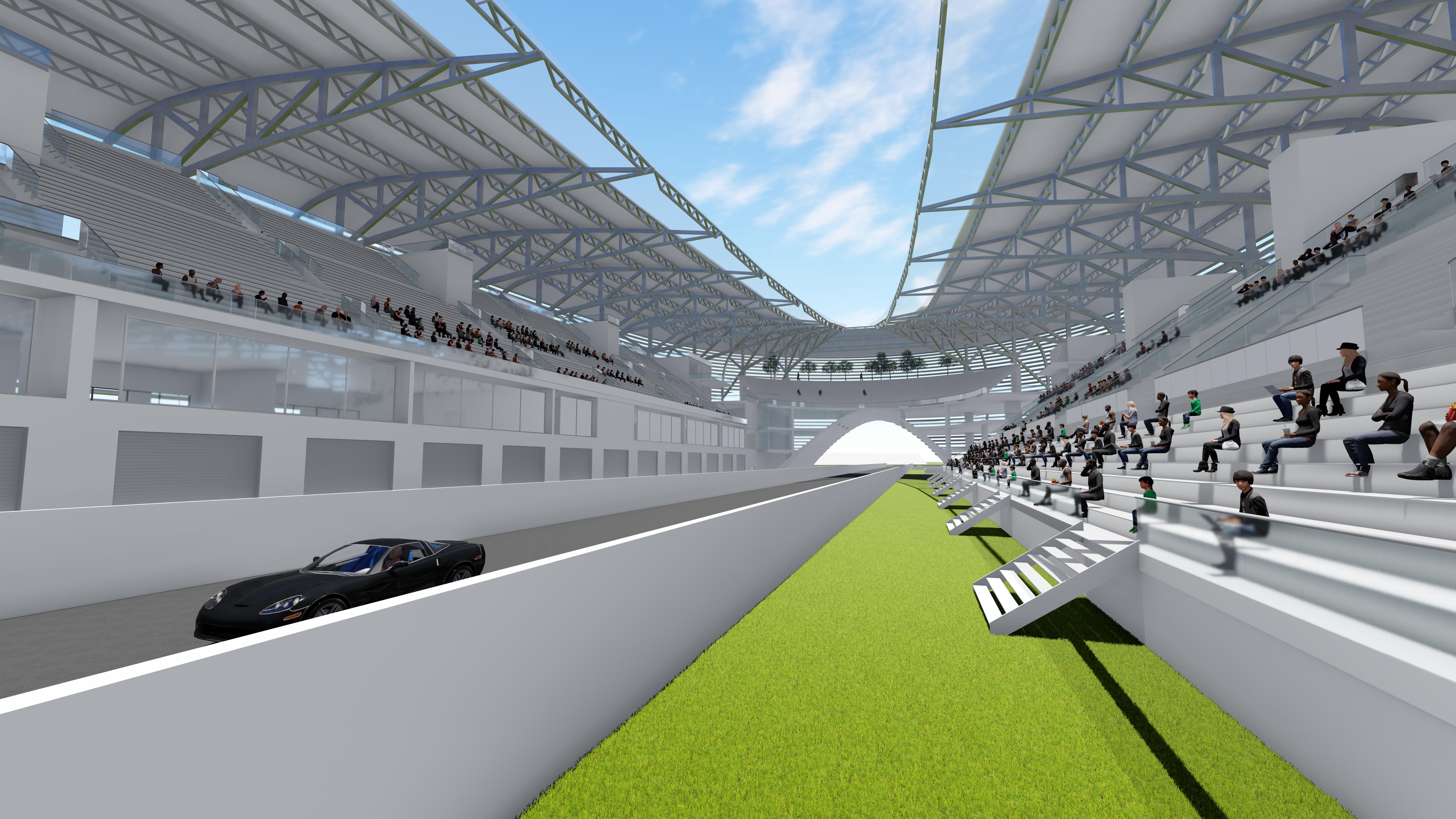 „Stadionul” de Formula 1 ar urma să fie prima construcție de acest fel din lume, această formă având un lung și marcant istoric în ceea ce privește întrecerile sportive ale tuturor timpurilor. Pentru a adapta acest tip de spațiu sporturilor cu motor, în care terenul nu poate fi conținut în totalitate în stadion în sine, dar și pentru a asigura o bună funcționalitate a programului, au fost necesare anumite adaptări ale formei unui stadion sau a unei arene tipice: forma mult mai alungită pe o direcție, decupajele la nivelul pistei care să permită trecerea mașinilor, precum și adoptarea unui înveliș semi-transparent (care să permită vizibilitatea dar să și filtreze parțial lumina) și orientarea gradenelor și către exterior, facilitând vizibilitatea către zonele virajate ale circuitului.