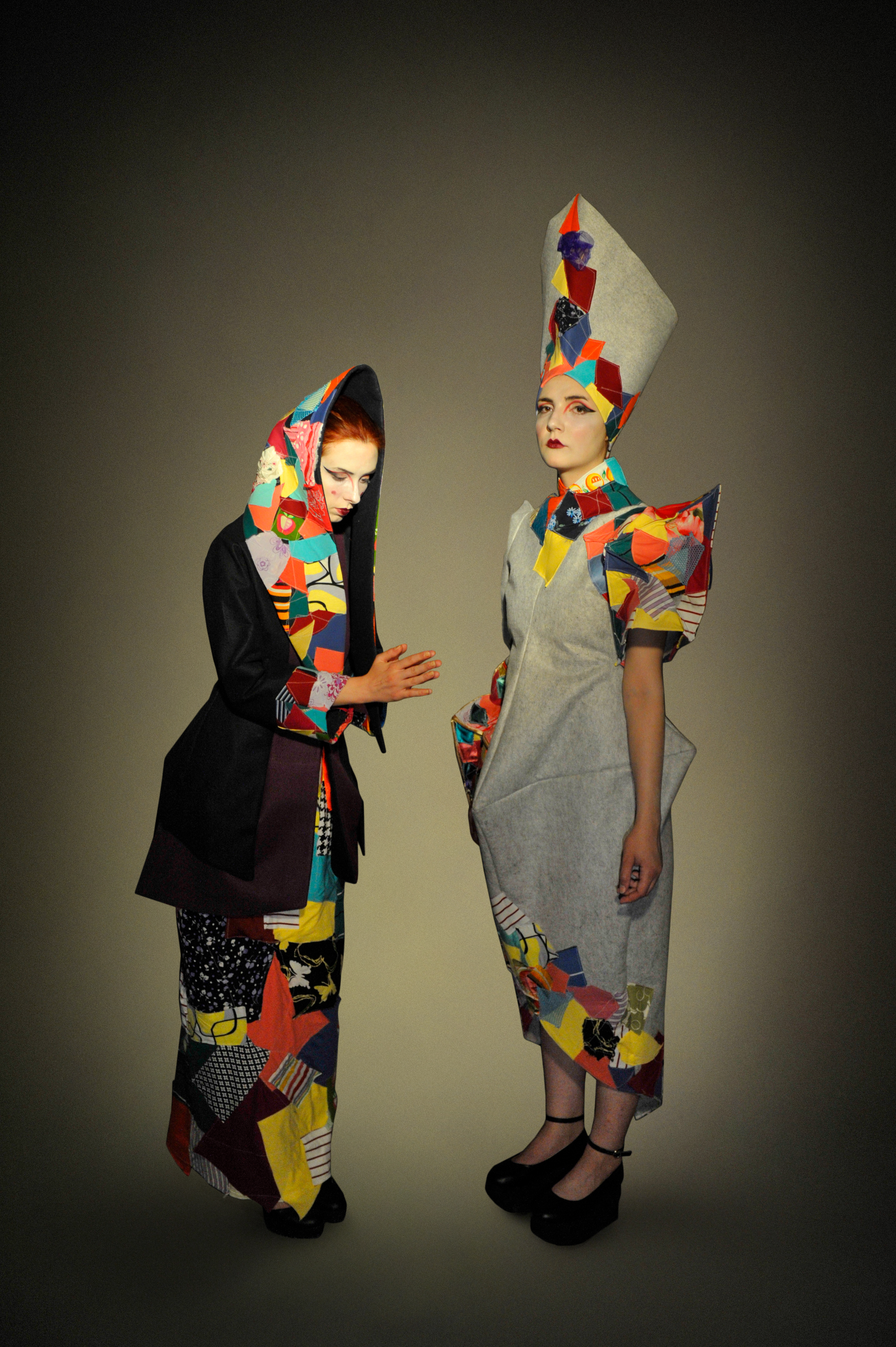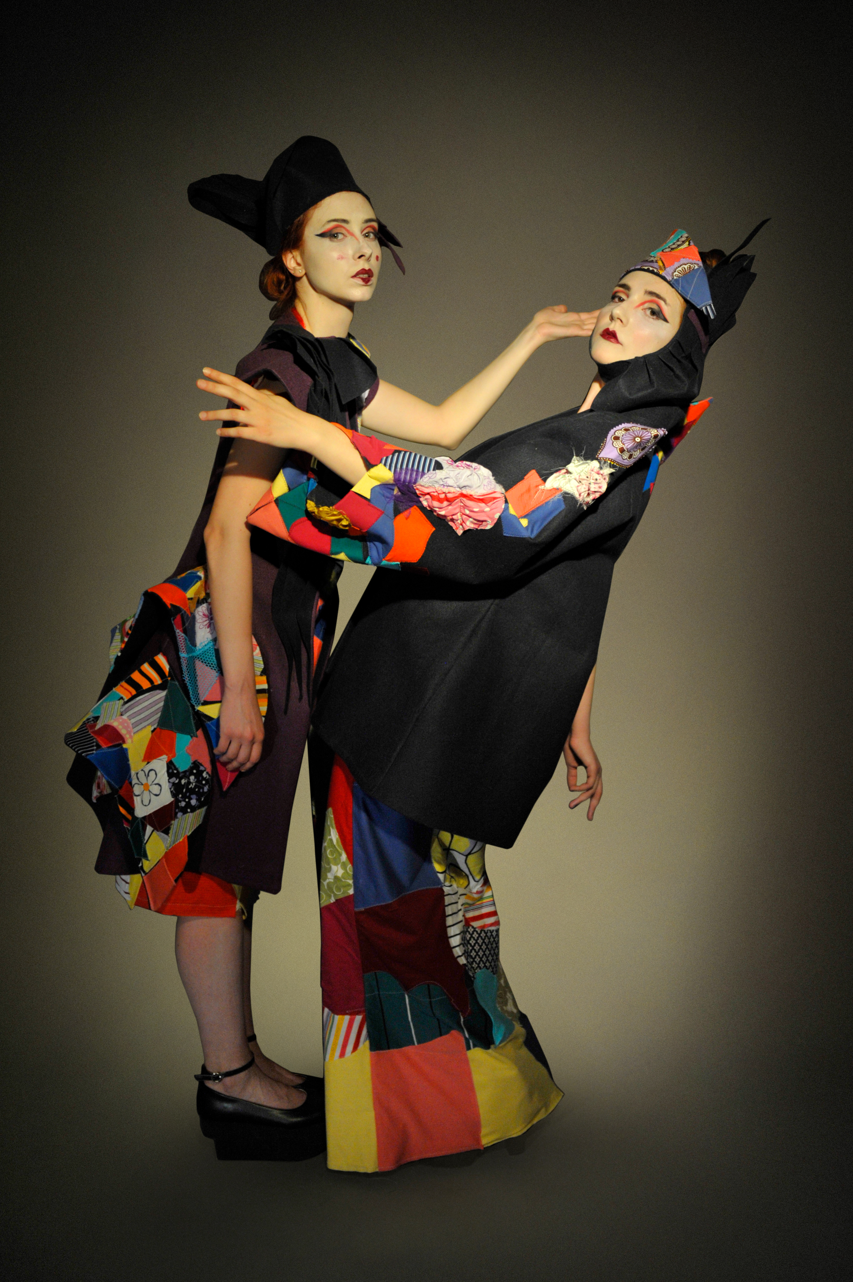 Designerul a propus o colectie de șapte piese vestimentare compuse din două straturi (rochie, fusta sau pantalon și jachetă tip kimono), realizate din materiale colorate, reciclate cusute cu model patchwork, aplicate pe fetru. Fiecare ținută este completată de accesorile de pus pe cap, care sunt realizate din același material și în același stil și papucii Okobo.
