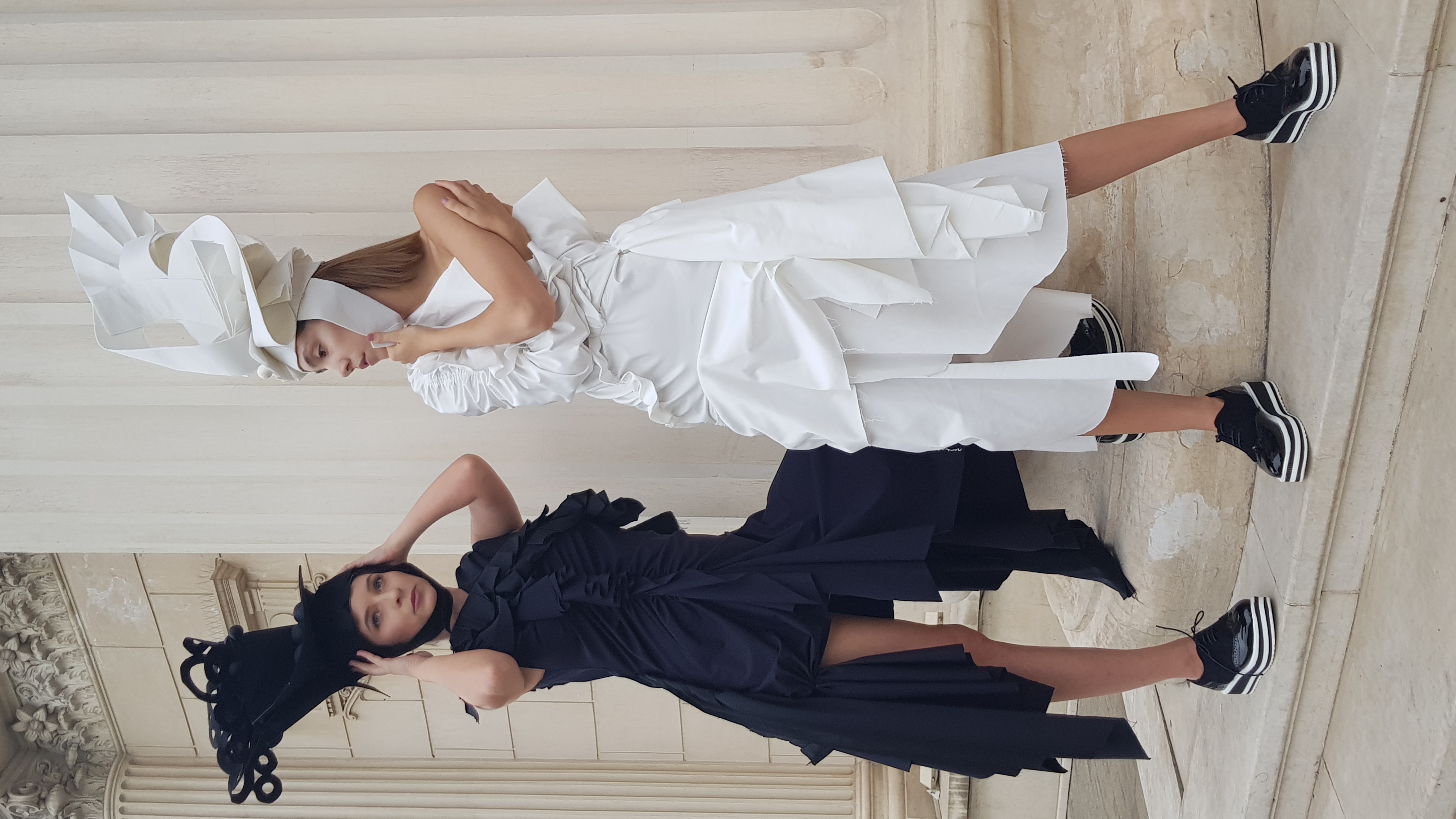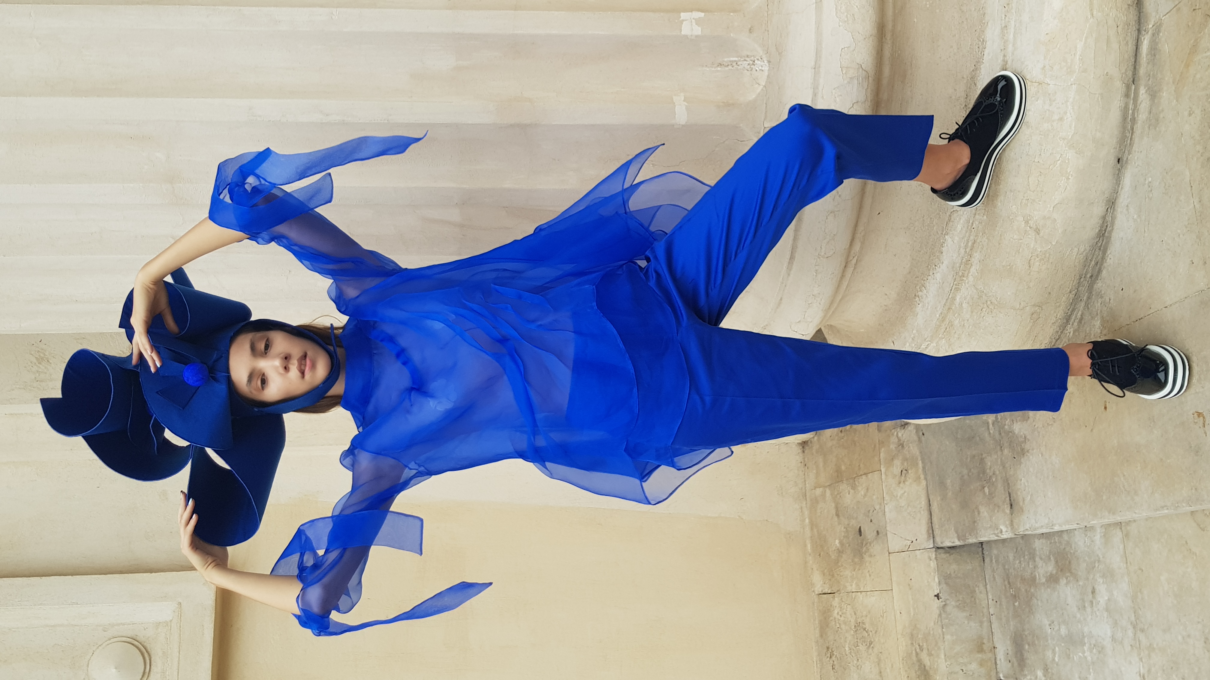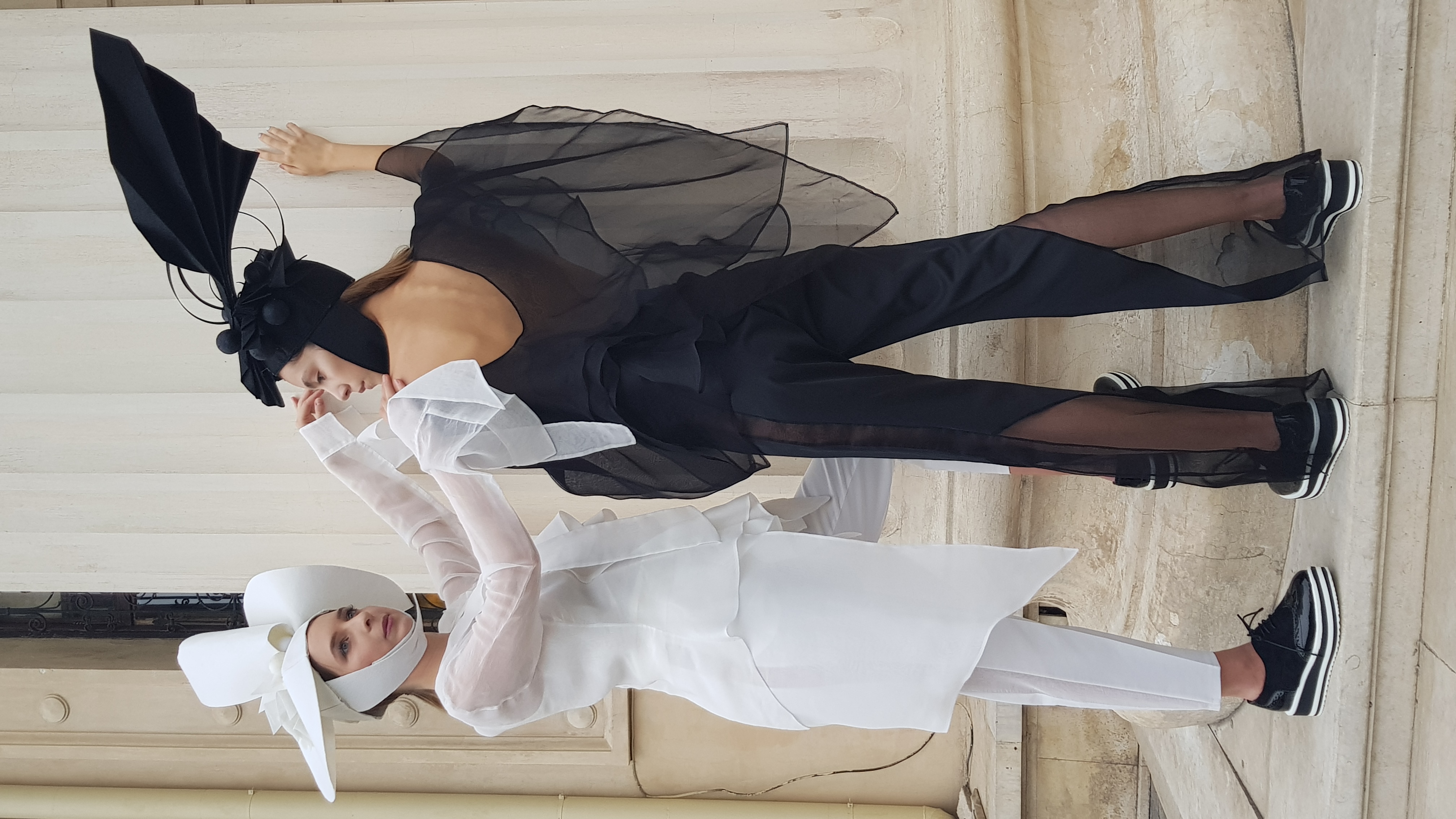 S-a urmărit obținerea unor veșminte cu accentul pus pe linia compozitională, formă și volum, croială în linii asimetrice, totul pe fondul unei palete coloristice de alb și negru și echilibrată de nuanțe strălucitoare de albastru, ce dezvăluie noi ipostaze ale feminitătii și eleganței femeii contemporane.