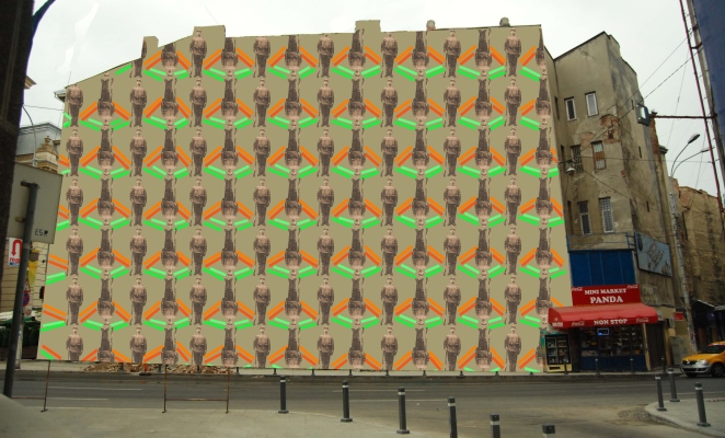 Calcanul, pe care se desfăşoară această compoziţie se află pe Calea Victoriei, sector 1, Bucureşti. Compoziţia este gândită ca o instalaţie colaj ce face referinţă la nou si vechi. Noul este reprezentat de neon, iar vechiul de atmosfera pe care o creează soldaţii.