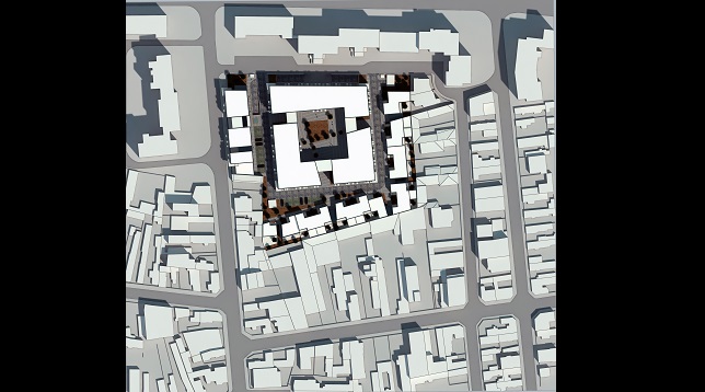 Pe latura vestică a sitului, edificiul propus continuă frontul existent prin crearea unor pauze în volumetrie, dând impresia că sunt mai multe clădiri separate. Partea opusă a volumetriei devine unitară prin intermediul unei cursive. Fiind aliniat la stradă, parterul edificiului se deschide și către publicul exterior ansamblului.