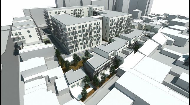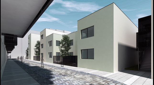 În partea sudică și cea estică, soluția propune locuințe similare cu cele înșiruite. Volumetria acestora iese din tiparul obișnuit, preluând gradul de fragmentare din zonă, atât pe verticală cât și pe orizontală. Prin această fragmentare se creează și o diversitate în tipurile de locuințe propuse, de la garsoniere până la triplexuri. Astfel, se încearcă o continuare a țesutului tradițional într-o manieră contemporană.