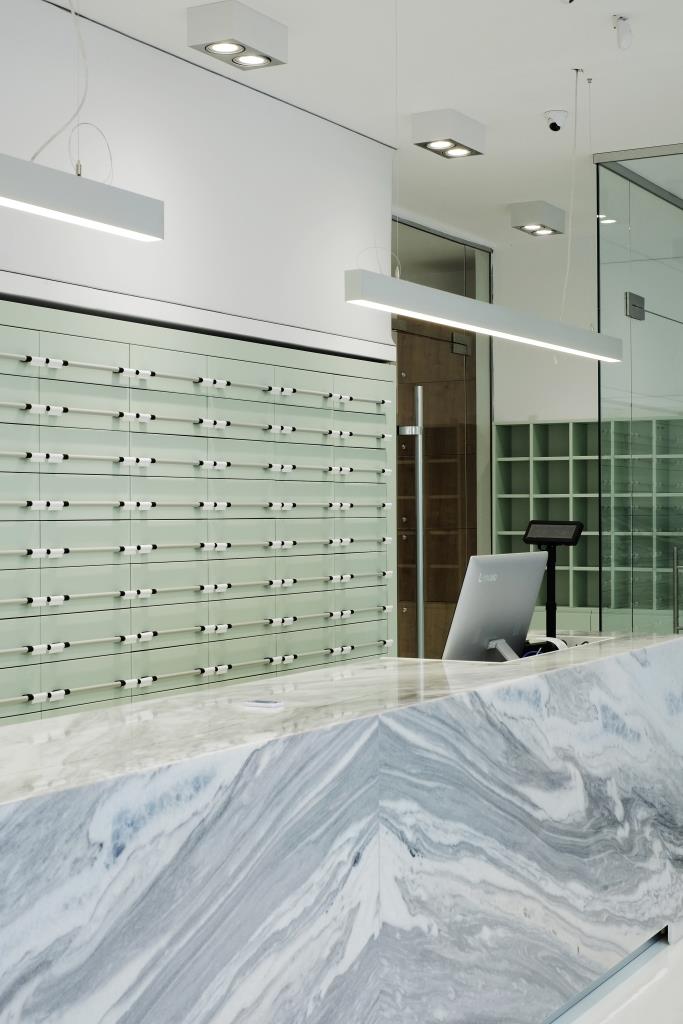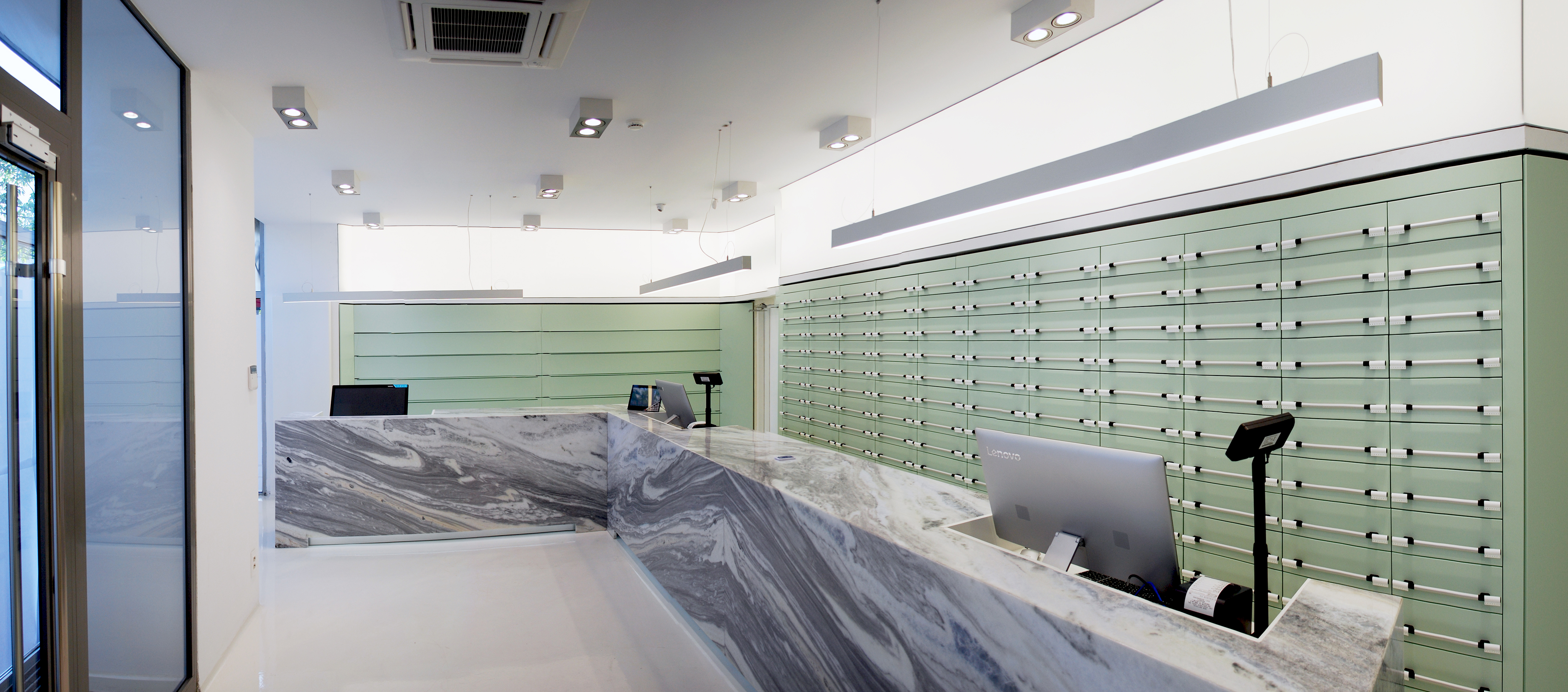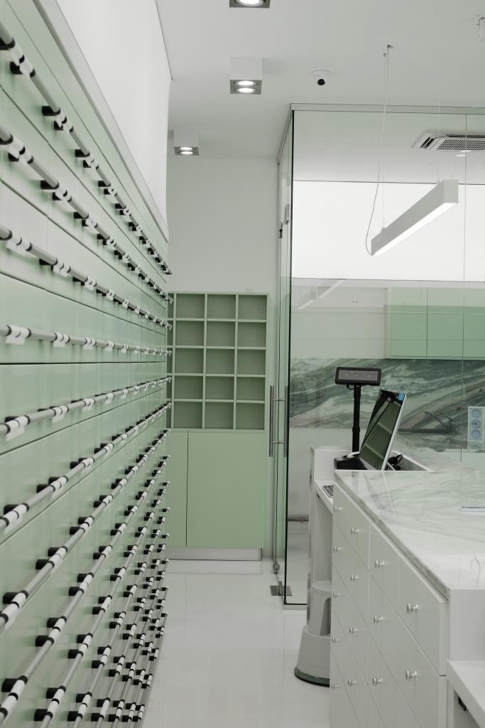 The challenge of the project was to create a space that goes back to the idea of a classical pharmacy, to a personalized care way where buyers consult with the pharmacist, where they cannot see the exposed drugs and at the same time to create a pharmaceutical preparation lab for special prescription medicine which had to be visible both from the inside and the outside of the pharmacy.