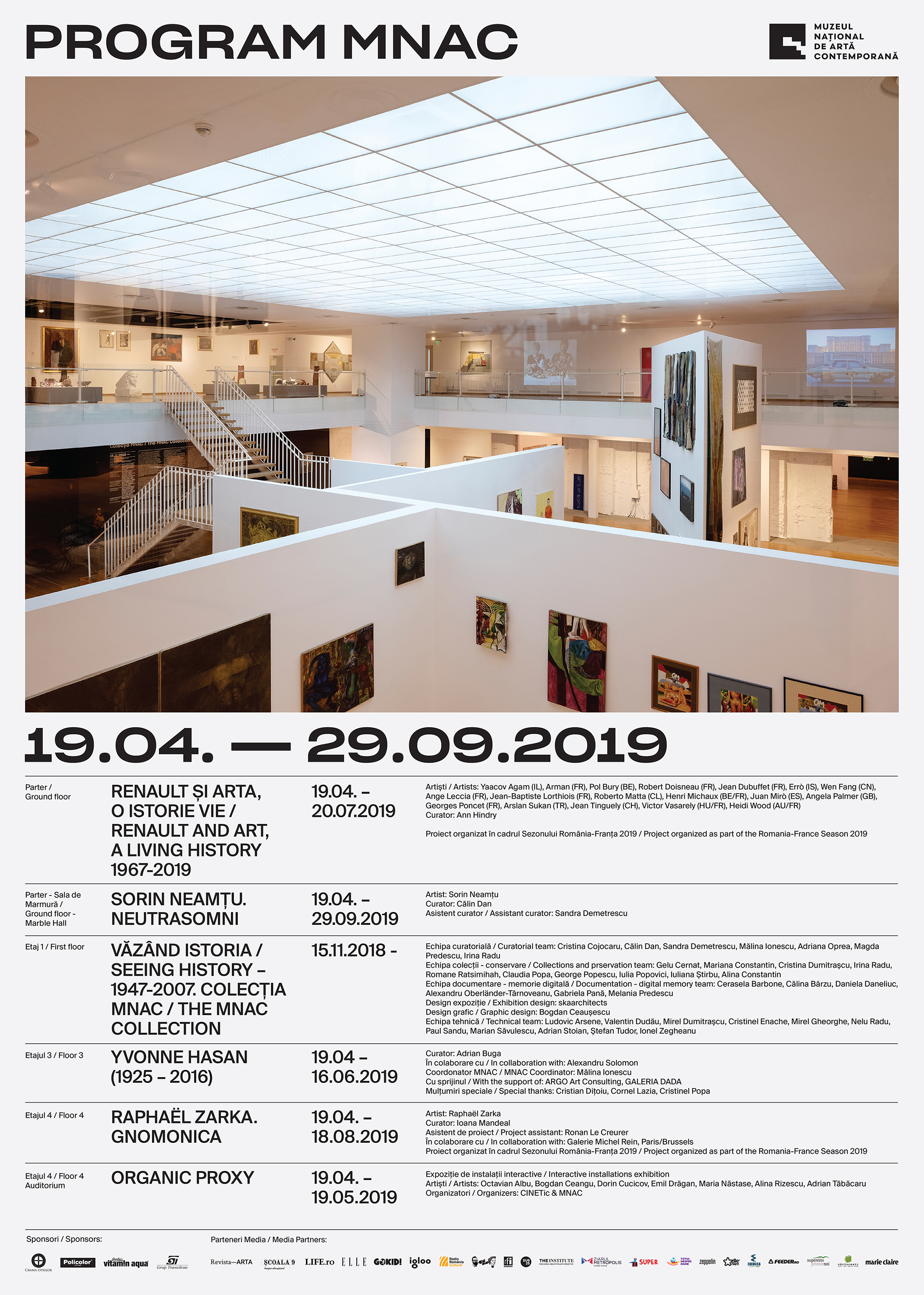 Patru etaje de artă contemporană și tot atâtea expoziții noi, dintre care colecția de artă Renault pentru prima dată în România. În scenografia murală creată de pictorul Christian Hidaka, o nouă viziune artistică: a prietenului său, sculptorul Raphaël Zarka. Yvonne Hasan ─ o imagine de ansamblu a unei vieți artistice prea puțin cunoscute. O privire în atelierul secret al lui Sorin Neamțu. Street Art pe scările interioare ale muzeului și o istorie a artei contemporane din România într-un discurs expozițional inedit.