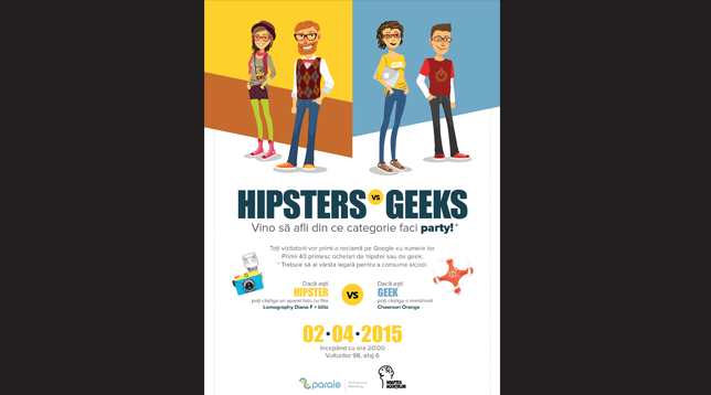 Îți punem câteva întrebări pentru a afla dacă ești în tabăra Hipsters sau în tabăra Geeks și ești recompensat cu o băutură specifică stilului tău. Toți participanții vor primi o reclamă specială pe Google cu numele lor, făcută de specialiștii noștri în Pay Per Click, iar primii 40 de participanți vor primi o pereche șmecheră de ochelari.