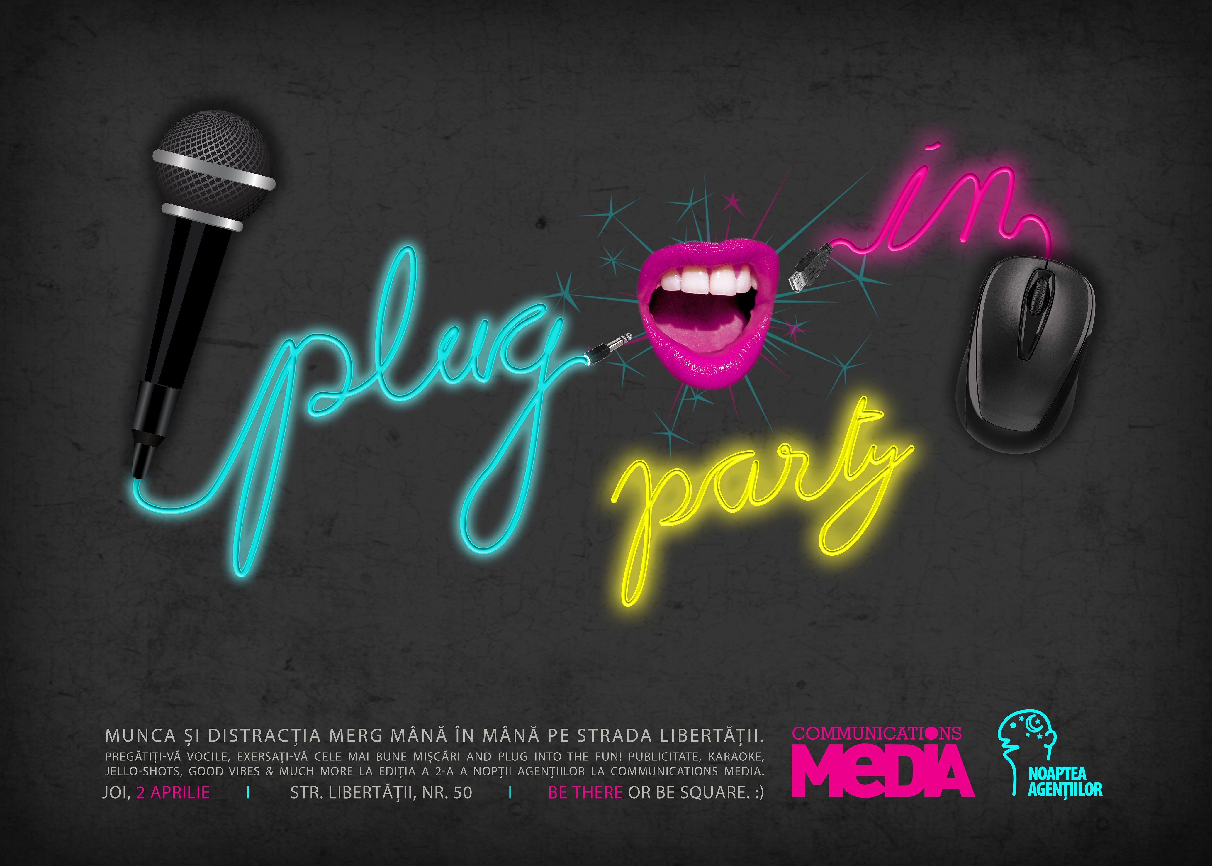 Pregătiți-vă vocile, exersați-vă cele mai bune mișcări, pentru că vă așteaptă o noapte electrică la Communications Media. Vom vorbi despre proiectele noastre preferate și vă vom împărtăși și distracția noastră favorită: singing at our desks. Vă așteptăm la un karaoke party, la care vom cânta, împreună cu voi, piesele noastre de corazon din timpul programului de lucru, melodii din reclame și nu numai. Vom avea muzică bună, jello-shots, culori neon, povești din publicitate, premii simpatice pentru cei mai curajosi mânuitori de microfon și o surpriză pentru urechile cele mai fine. ;)