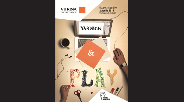 “La Vitrina Advertising e mereu Work & Play, că nici nu ne mai dăm seama când trecem dintr-una într-alta. Acum că Noaptea Agențiilor ajunge și la Cluj-Napoca, ne deschidem porțile și la propriu și la figurat și vă așteptăm cu idei crețe, voie bună cât cuprinde și câte o activitate faină pentru fiecare. V-am făcut curioși? Haideți la Work & Play @ Vitrina”.