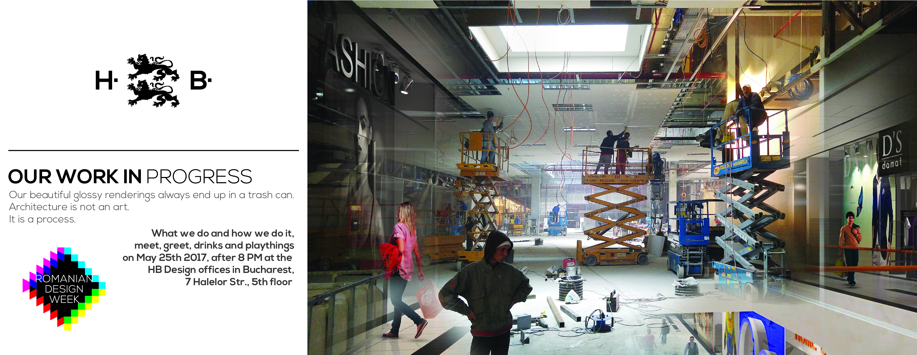 O documentare a ceea ce face HB Design Team de doi ani încoace: expo poze cu Megamall, CityParkMall, concursuri câștigate și concepte minunate alături de proiecții cu poze din șantiere.