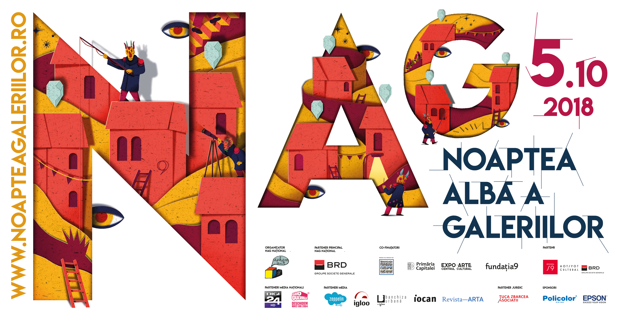 O nouă ediţie a Nopţii Albe a Galeriilor - NAG va avea loc vineri, 5 octombrie 2018 în galerii de artă, institute culturale, spaţii alternative, huburi creative şi ateliere de artist din orașele: Bucureşti, Arad, Braşov, Cluj Napoca, Craiova, Iaşi, Miercurea Ciuc, Sfântu Gheorghe, Petrila, Reşiţa, Sibiu, Târgu Mureş şi Timişoara.